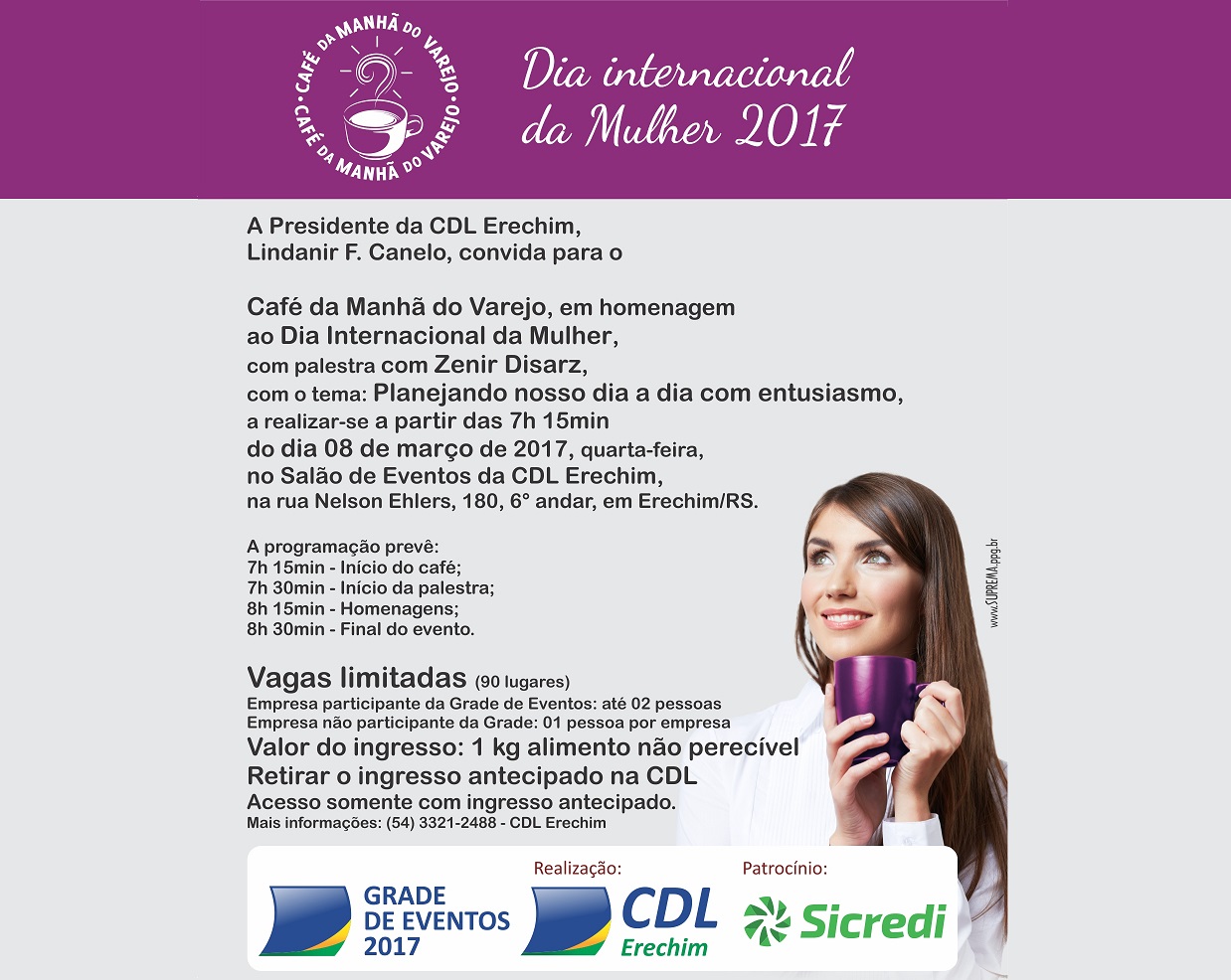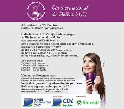 No dia 8 de março, quarta-feira, a Câmara de Dirigentes Lojistas de Erechim (CDL) realiza mais uma edição do tradicional Café da Manhã do varejo. O evento acontece no Salão de Eventos da CDL e tem como objetivo homenagear a passagem do Dia Internacional da Mulher.
