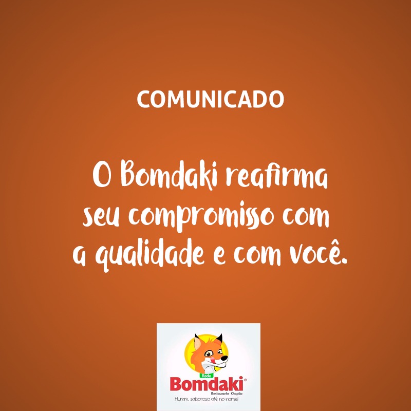 Por fim, agradecemos a compreensão de todos aqueles que conhecem o nosso trabalho. Comunicamos que o Bomdaki esteve fechado brevemente pela falta de produtos e que já estará aberto hoje à noite, com a qualidade de sempre.