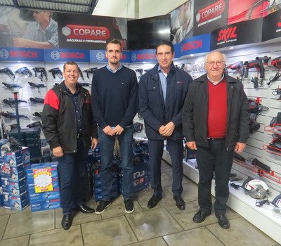 Em reunião, realizada na tarde de quinta-feira (18), na sede da Copare em Erechim, os diretores Solani Rigo e Leonardo Rigo receberam representantes da empresa alemã Bosch. Estiveram presentes, o presidente regional da Divisão de Ferramentas Elétricas da América Latina da Bosch, Leon Kaiser e o consultor comercial, Tiago Pimentel. O encontro foi marcado pelo fortalecimento da parceria, que já se estende por cinco anos, e para fomentar a comercialização e a cadeia econômica e produtiva das empresas.