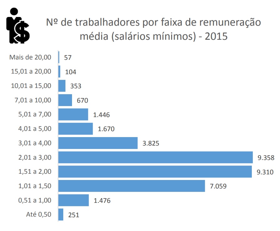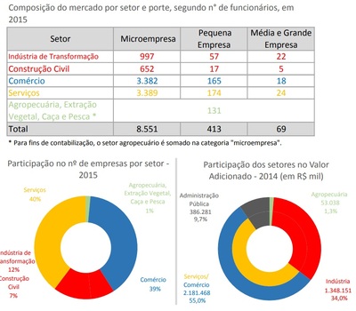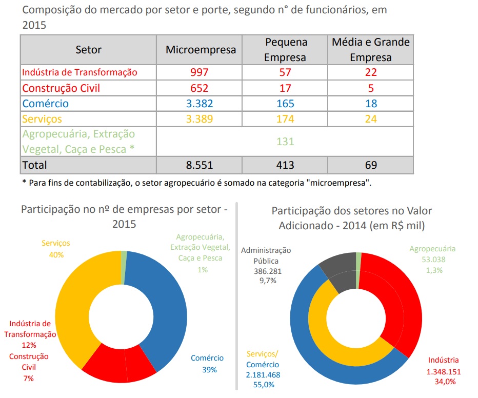 Os setores com maiores números de vínculos empregatícios são os de indústria, serviços e comércio. Quanto ao valor adicionado, isto é - o que a atividade acrescenta aos bens e serviços consumidos no seu processo produtivo - estes também são os setores de destaque, sendo comércio e serviços responsáveis por mais de R$ 2,1 milhões (55%), e indústria por R$ 1,3 milhão (34%).