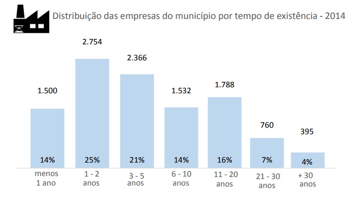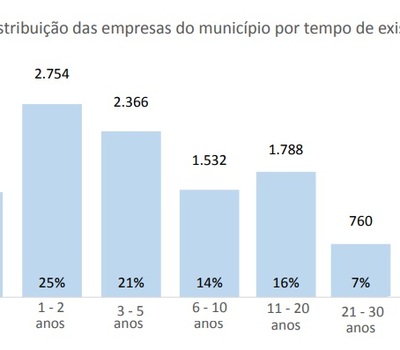 A maioria das empresas presentes no município são jovens, do ponto de vista do tempo de existência. O levantamento aponta que 2.754 - o que equivale a 25% das empresas - têm até dois anos. Outras 2.366 (21%) têm de três a cinco anos de existência enquanto 11% (1.135) tem mais de 20 anos.