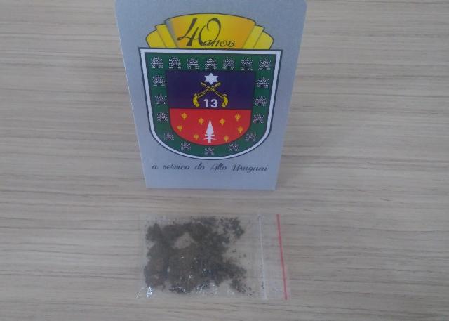 Às 10h, uma guarnição da Brigada Militar efetuou a abordagem de indivíduo suspeito na Rua Rejane de Almeida Polasek, no Bairro Amanhecer. Em revista pessoal ao mesmo foi encontrada uma porção de maconha pesando 4,92g no bolso de sua calça. O homem de 19 anos de idade foi ouvido em termo circunstanciado confeccionado no local pelos policiais e após foi liberado.