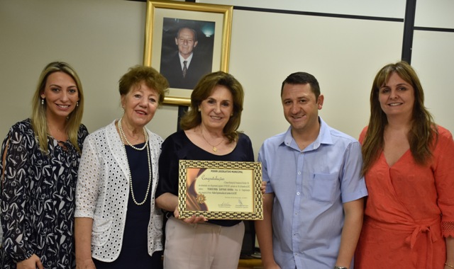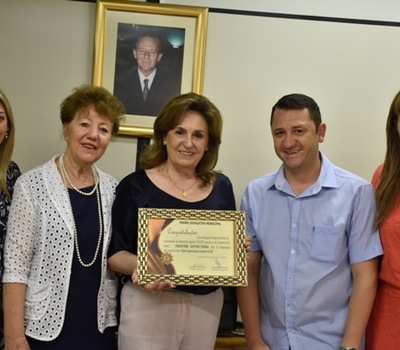 A empresária supermercadista Terezinha Sonda, recebeu os votos de congratulações da Câmara de Vereadores de Erechim. A entrega da homenagem foi realizada pela vereadora Eni Scandolara (PP), acompanhada pelo ex-presidente do poder Legislativo, vereador Ale Dal Zotto (PP). O reconhecimento é pela conquista do Prêmio Mulher Supermercadista. O ato de entrega foi prestigiado pela filhas da empresária, Caroline e Cristiane Sonda Arioli.