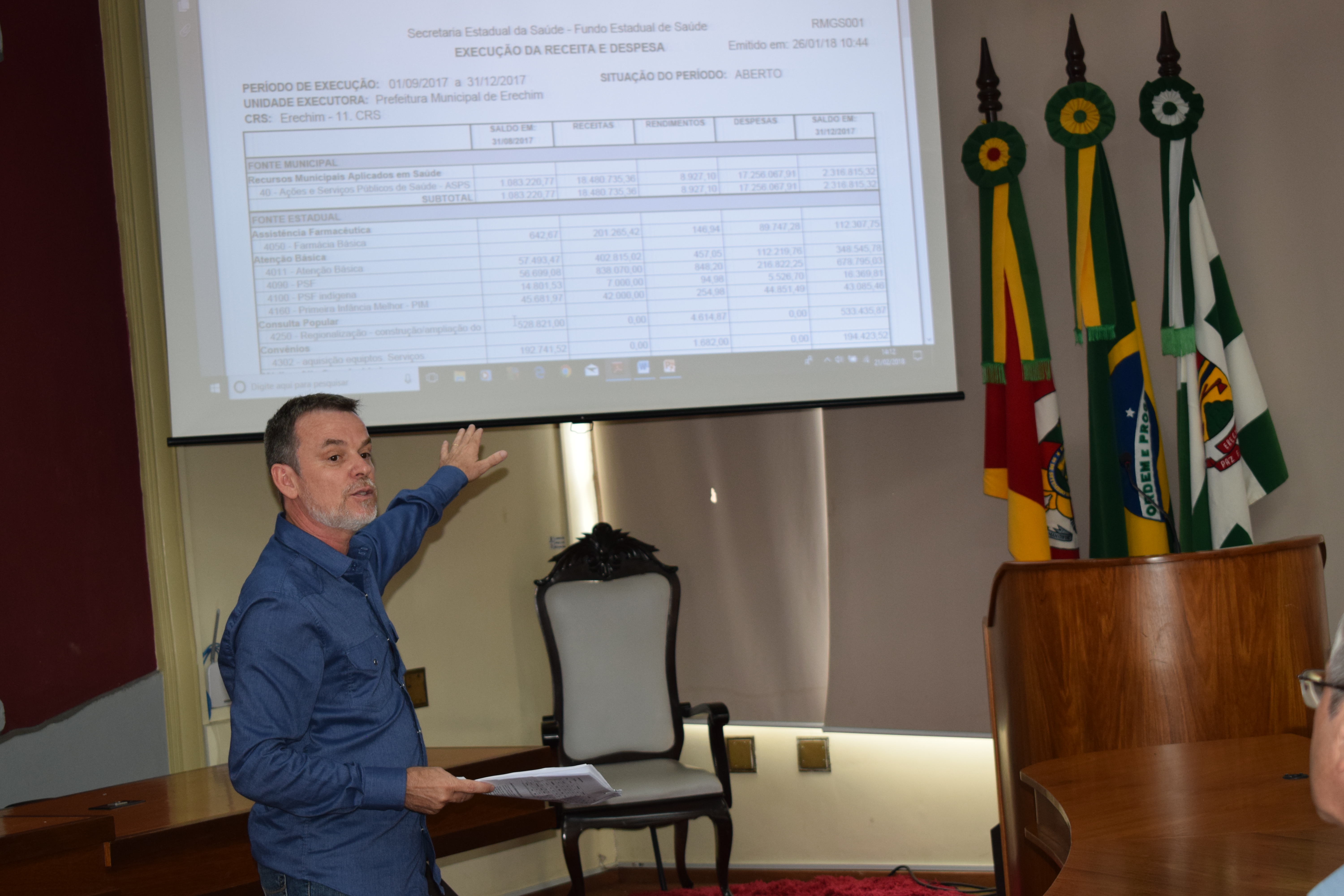 Na tarde da última quarta-feira (21), em audiência pública realizada na Câmara de Vereadores de Erechim, a administração municipal, por meio da Secretaria Municipal de Saúde (SMS), apresentou o relatório de gestão municipal do último quadrimestre e do ano de 2017. Jackson Arpini, secretário adjunto, Dorvalino Rossi, diretor administrativo e Elenise Dalló, coordenadora de rede de relatórios da SMS, expuseram números e indicadores da saúde aos vereadores presentes, assessores parlamentares e demais representantes da comunidade local. Também participou da audiência o presidente do poder Legislativo, vereador Rafael Ayub (PMDB).