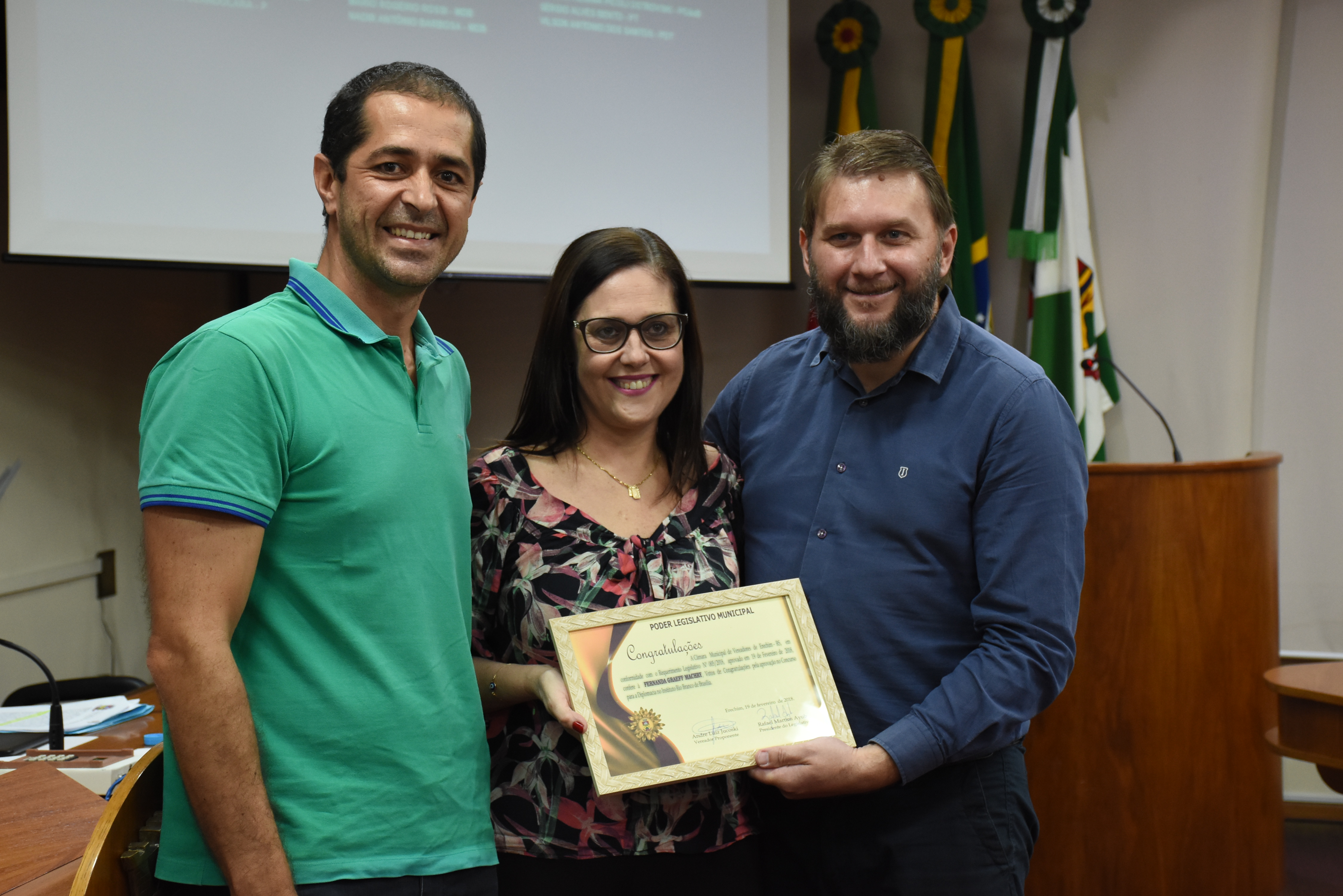 O presidente do Legislativo erechinense, Rafael Ayub (MDB), e o vereador André Jucoski (PDT), autor da solicitação, realizaram, durante a sessão ordinária da última segunda-feira (5), a entrega de Votos de Congratulações à diplomata Fernanda Graeff Machry. Recentemente, a jovem de 27 anos foi aprovada no concurso para a Diplomacia no Instituto Rio Branco, em Brasília, e tomou posse em janeiro. Na ocasião da homenagem, Fernanda não pôde comparecer e foi representada por sua mãe, Jaqueline Graeff.