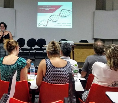 A professora Louisiana fez visitas aos laboratórios de pesquisa e apresentou os resultados prévios da sua pesquisa de doutorado, que está em fase final, em Ciências Biológicas na UFRGS. Seu estudo investiga os efeitos de diferentes modalidades de exercício na memória e marcas epigenéticas em hipocampo de ratos Wistar durante o processo de envelhecimento.