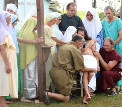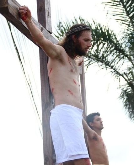 A representação da Paixão de Cristo desta Sexta-feira Santa (30) iniciou no bairro linho, e contou com a presença de centenas de fiéis acompanhando a procissão que seguiu em direção à Capela Nossa Senhora Aparecida, onde foi realizada a cena da crucificação de Jesus.