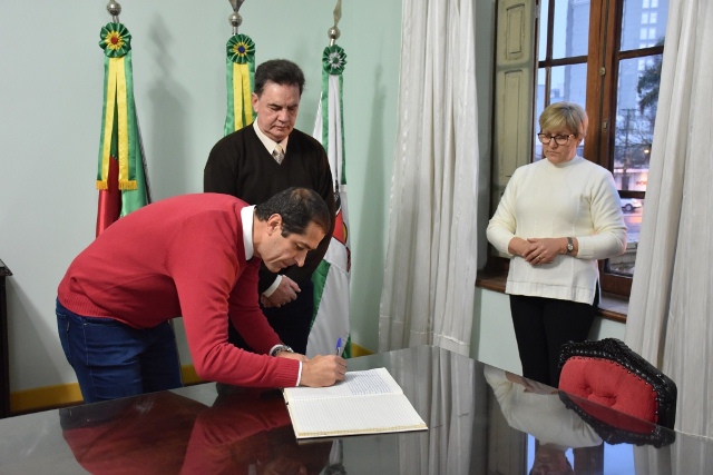 Foi realizada na manhã desta segunda-feira (25) a solenidade de transferência de cargo do prefeito Luiz Francisco Schmidt ao presidente da Câmara, vereador Rafael Ayub (MDB). O ato, ocorrido no salão nobre da prefeitura, contou com a presença de secretários do Executivo, além dos parlamentares Alderi Oldra (PT), Claudemir de Araújo (PTB), Emerson Schelski (PSDB), Eni Scandolara (Progressistas), Gilson Serafin (PSD) e Ilgue Rossetto (PV) – este como presidente em exercício do poder Legislativo. Ayub permanece no cargo até a próxima quinta-feira (28), quando Schmidt retorna de viagem oficial a Brasília, onde cumprirá agenda no Tribunal de Contas da União e nos ministérios da Saúde e Educação, buscando concretizar a transformação da Fundação Hospitalar Santa Terezinha em hospital universitário.