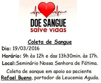 O Centro Oncológico de Apoio Luciano (Caol) e o Hemopasso realizam, neste sábado (19), coleta de sangue no Seminário Nossa Senhora de Fátima em apoio ao paciente Rafael Bueno, portador de leucemia aguda.