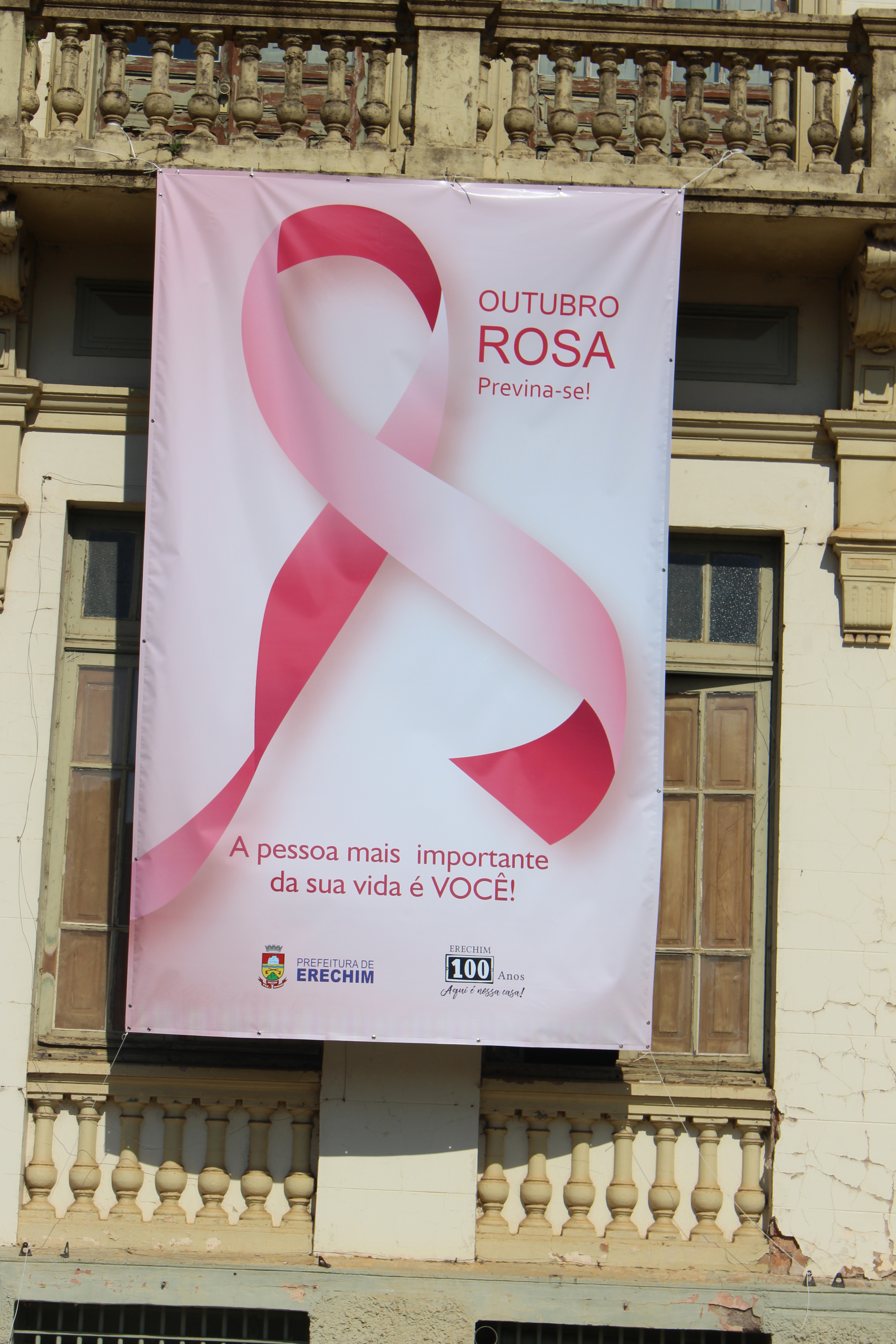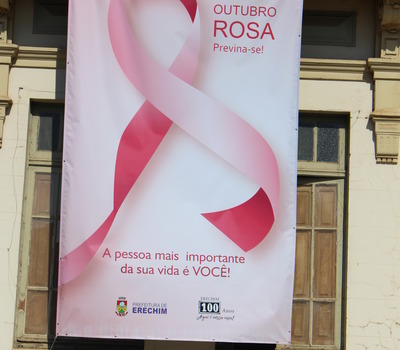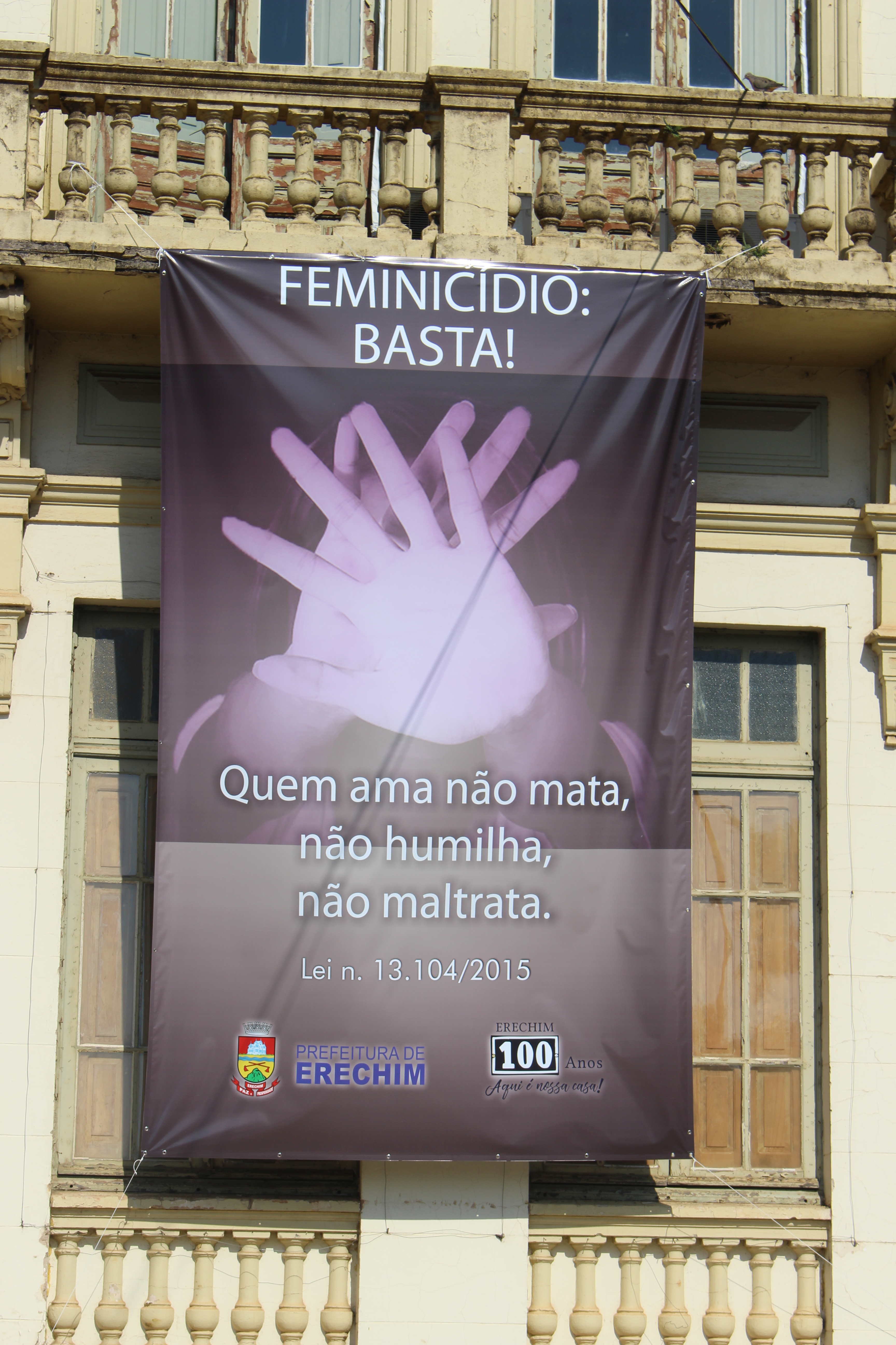 A fachada da prefeitura de Erechim exibe um banner para chamar a atenção de todos que por ali passam sobre o crime de feminicídio, previsto na Lei 13.104/2015. A iniciativa antecede outro assunto de importância para o público feminino: o câncer de mama. Este, igualmente destacado no mesmo local da Praça da Bandeira, lembra a realização da Campanha Nacional Outubro Rosa.