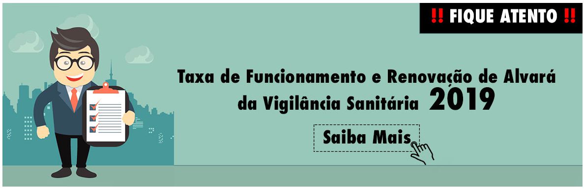 A Secretaria Municipal da Fazenda alerta para as datas de vencimentos de taxas. A partir deste ano a taxa de funcionamento, com vencimento em 31 de janeiro, e a taxa de renovação do alvará de Vigilância Sanitária, com vencimento em 28 de fevereiro, não mais serão enviadas via Correios.