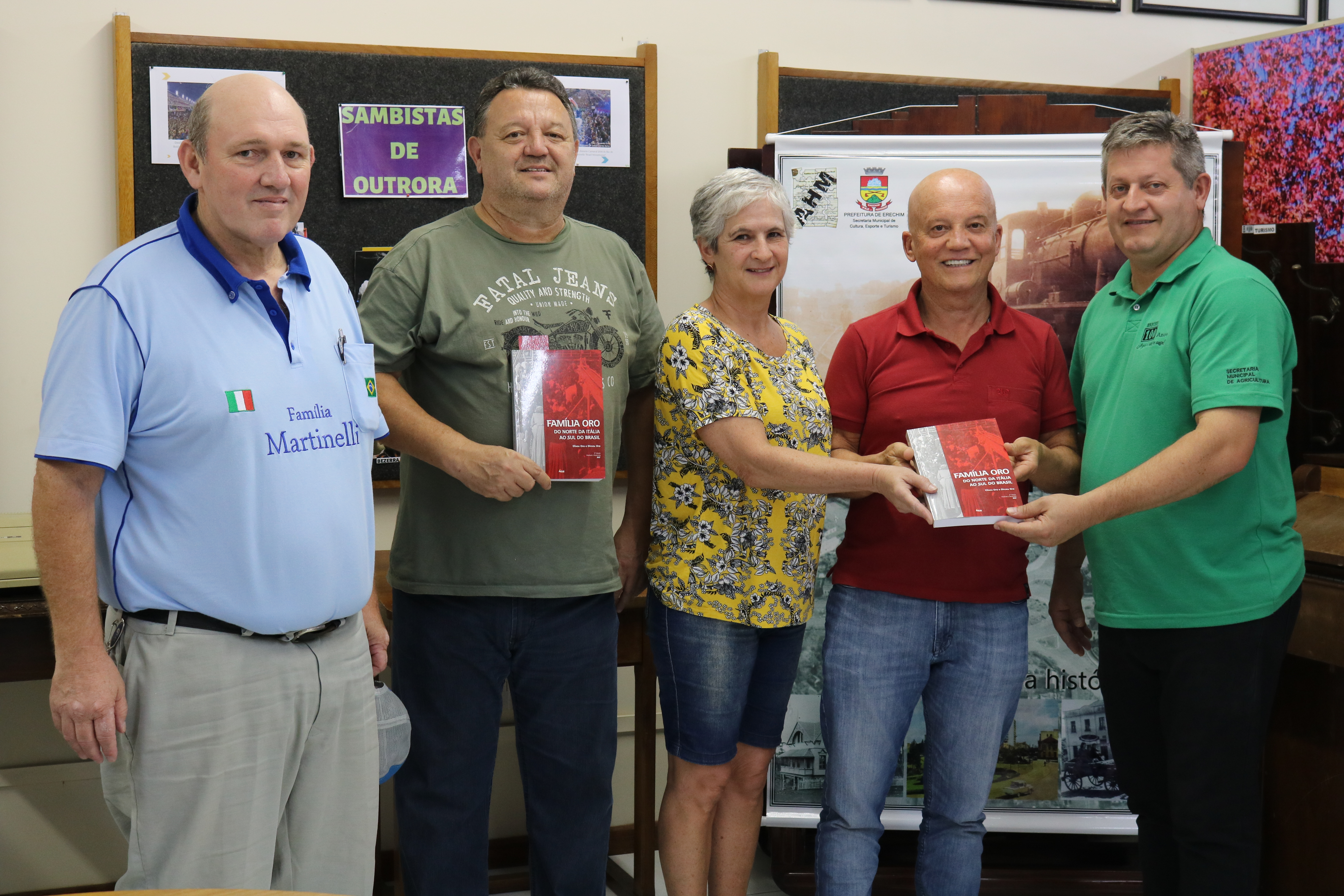 Na oportunidade, Dirceu fez a entrega de exemplares do Livro "Família Oro: Do Norte da Itália ao Sul do Brasil”, para a coordenadora do Arquivo Histórico, Maria Carmencita Fernandes e ao Secretário da Secretária de Cultura, Esporte e Turismo Leandro Basso.