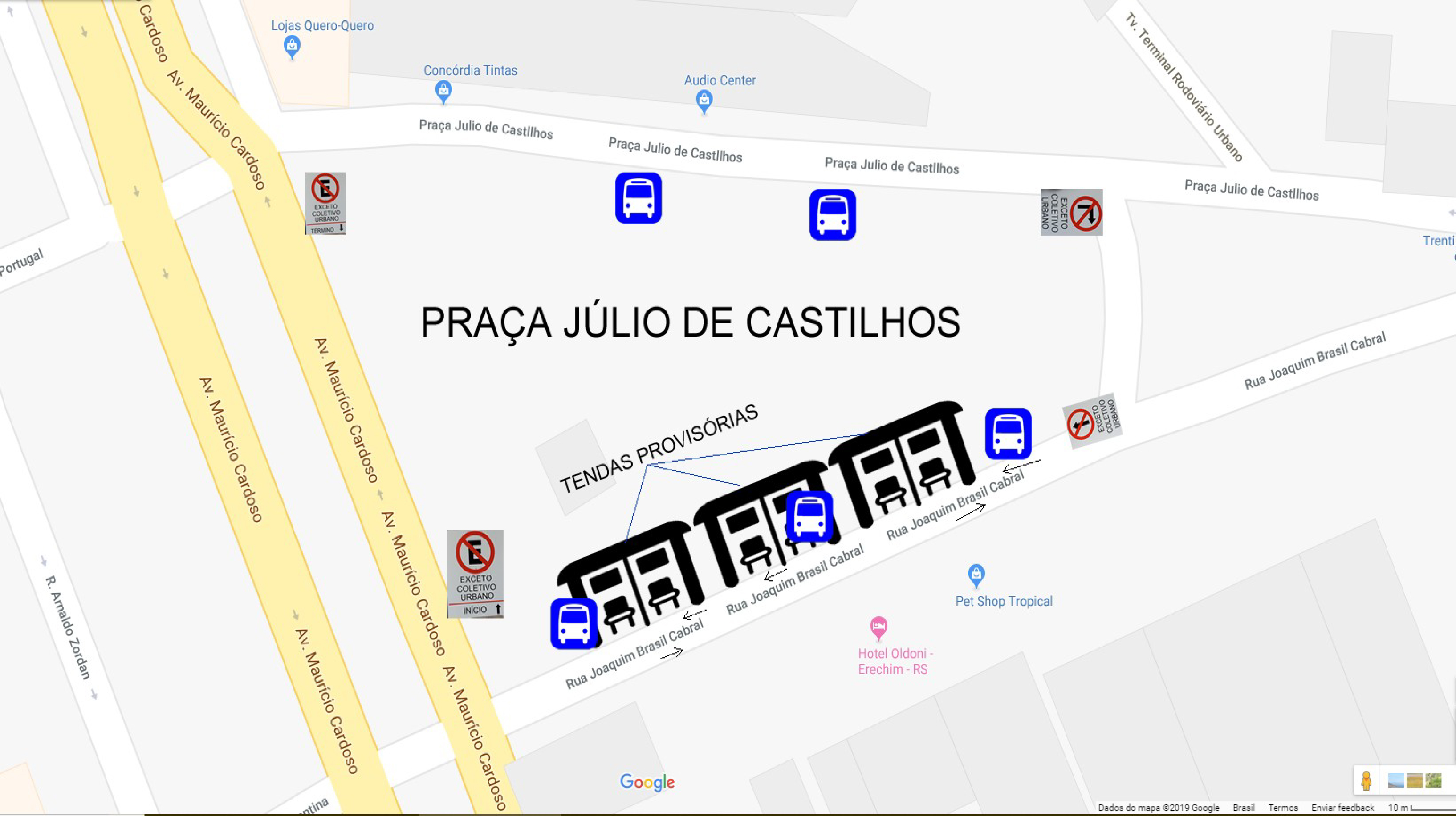 O trânsito ficará semelhante ao terminal antigo, com a alteração de proibição de estacionamento na Av. Maurício Cardoso (extensão que compreende a Praça) onde ficará estacionamento de espera para os ônibus. Na lateral, em frente a antiga Autolândia, ficará a última parada dos urbanos antes de se deslocarem para a garagem, momento em que será somente de desembarque. No terminal serão instaladas tendas provisórias. Em anexo croqui das modificações.