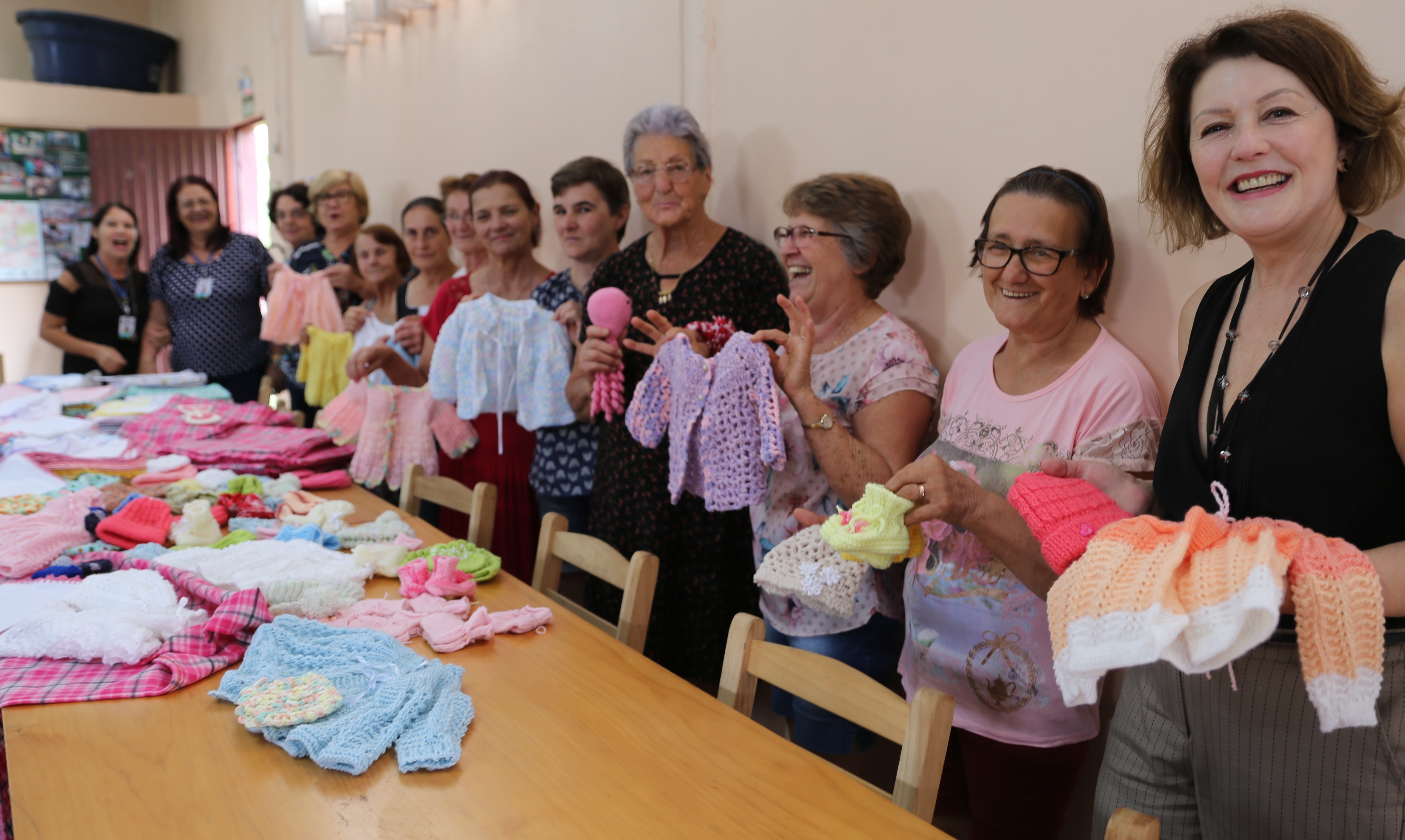 Parcerias também são bem-vindas e somam ao objetivo de acolhida e suporte do Programa a mães e bebês do Município. Nesta quinta-feira (4), a primeira-dama Rosmari, acompanhada de sua equipe de Gabinete, recebeu dezenas de peças produzidas por grupo de mulheres da Comunidade Boa Vista. Materiais como linhas, lãs e tecidos foram repassados a elas que em contrapartida doaram seu tempo e talento. O resultado dessa parceria foram dezenas de sapatinhos de lã, toucas, mantas, casaquinhos de crochê, feitos pelas mãos do grupo.