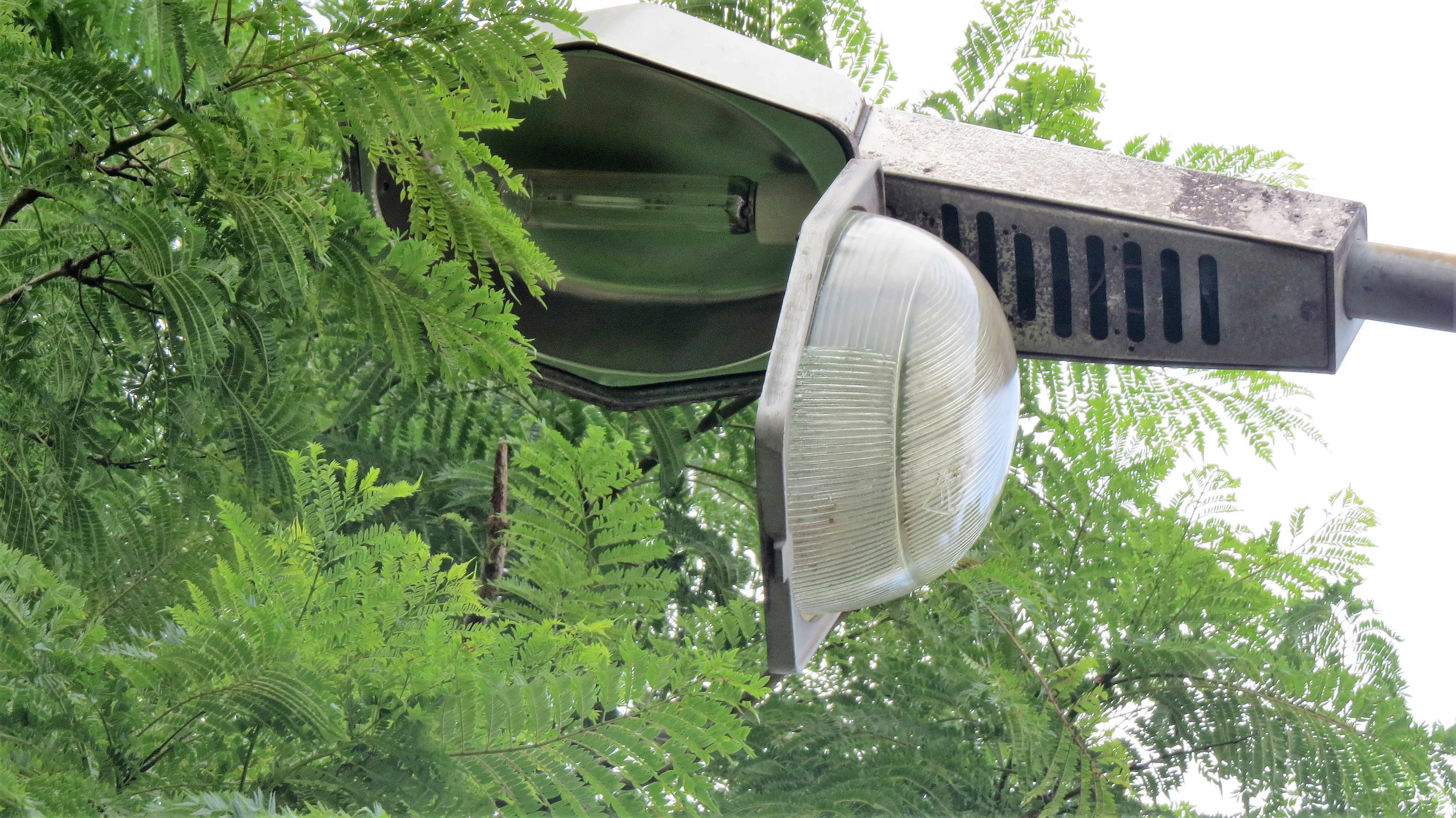 Na foto, mostra as consequências da falta de manutenção. Uma árvore do meio do canteiro, cresceu demais e pendeu sobre um poste, cobrindo a lâmpada. Mesmo se não tivesse coberto a lâmpada, o problema seria o mesmo. Ela está queimada e ainda aberta (não sei se quebrado o engate).
