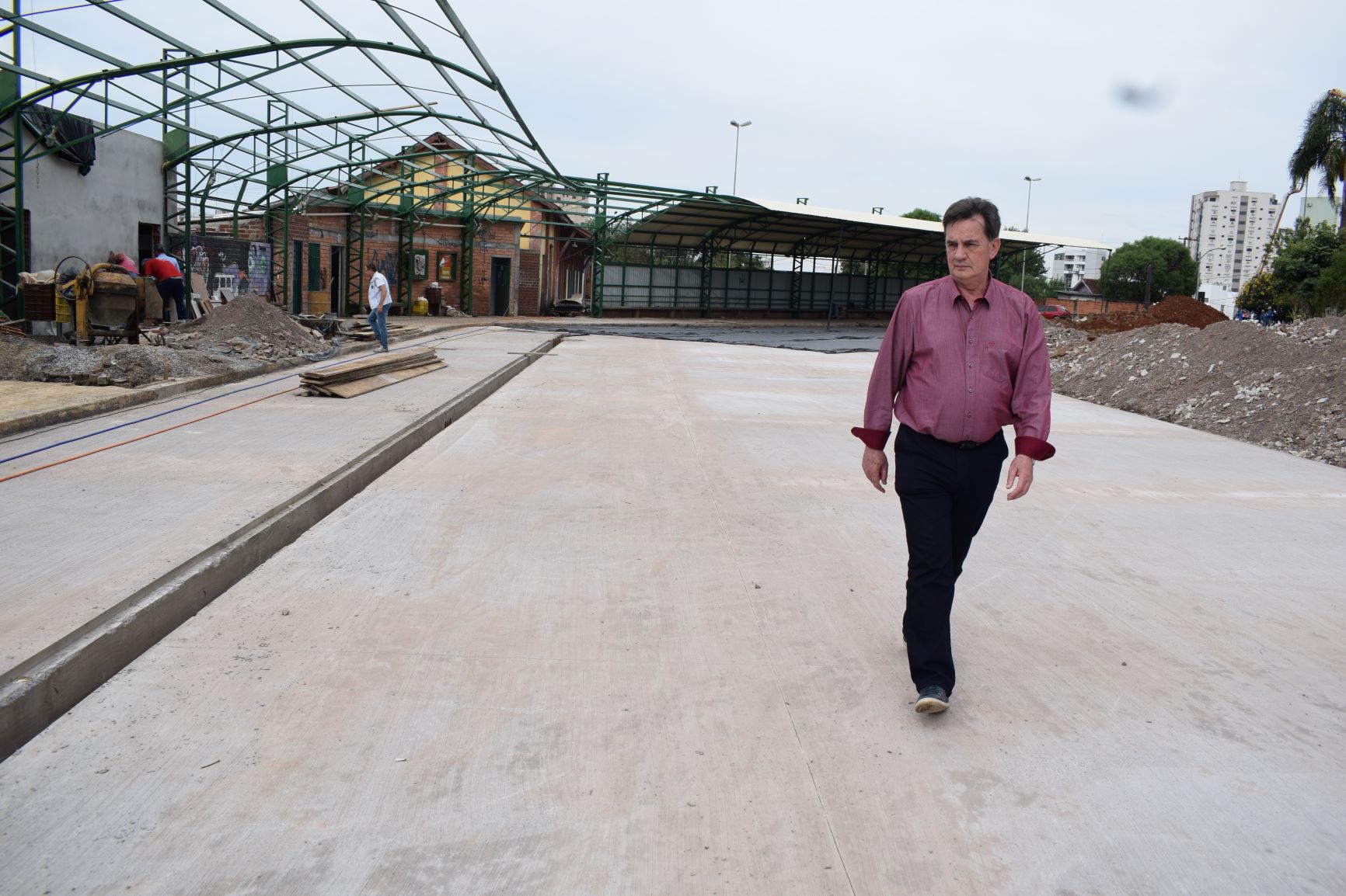 O prefeito Luiz Francisco Schmidt, acompanhado pelo secretário de Obras Vinícius Anziliero, do Chefe de Gabinete, Beto Fabiani e do engenheiro do Município, Paulo Bastos, esteve na tarde desta quinta-feira, 25, junto ao Terminal Rodoviário Urbano de Erechim, momento em que era colocada a última camada de concretagem do piso.