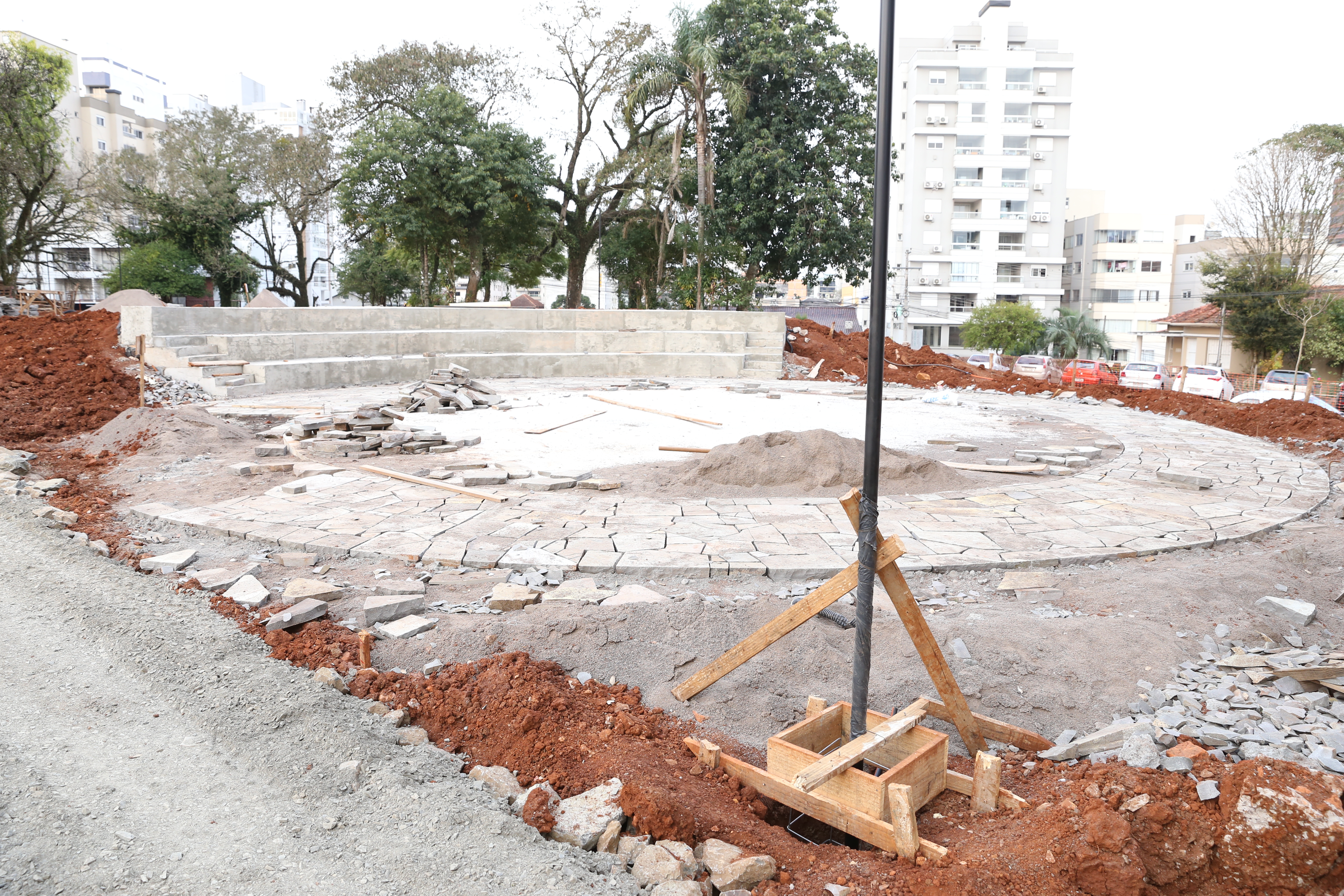 Em andamento o passeio em basalto interno próximo a quadra poliesportiva, a conclusão da base principal e posteriormente será feito um piso de concreto armado e início da locação dos postes da iluminação.