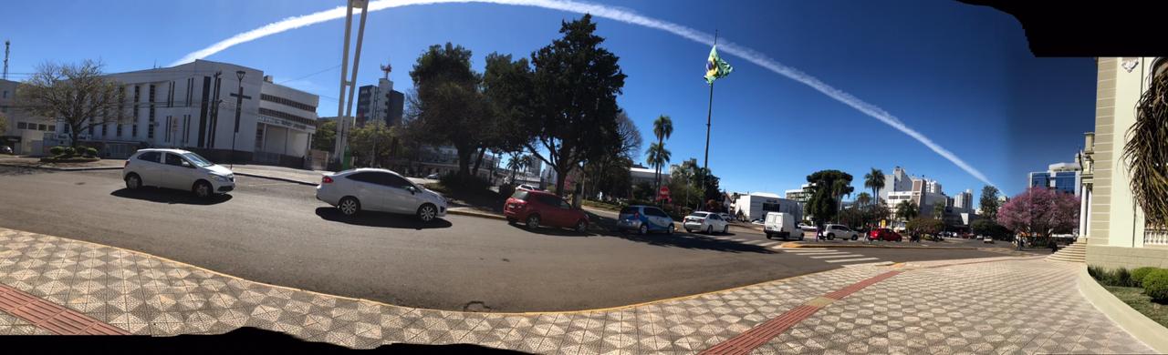 O vereador Ale Dal Zotto (PSB) registrou essa imagem perto do meio dia de ontem (15) quando saia da Câmara de Vereadores. Olhou para o céu e viu um rastro de fumaça, feito por um avião (aliás, o que passa de avião por Erechim, mas por cima), num formato diferente: “parecia um arco íris de nuvem”. Registrou (e eternizou) o momento com a câmara panorâmica de seu celular: “Acredito na beleza divina”.