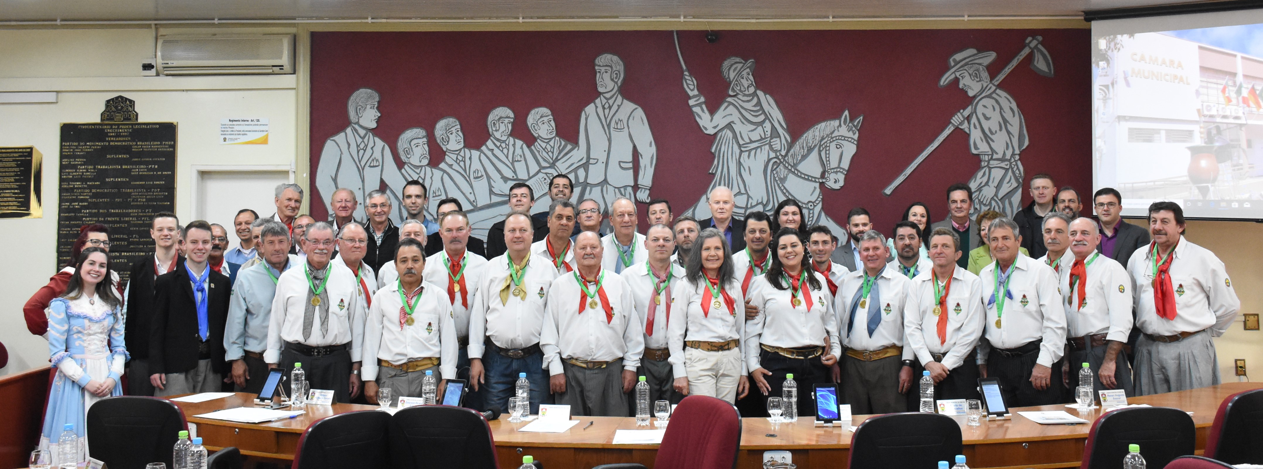 O plenário da Câmara Municipal de Vereadores de Erechim foi tomado pelo espírito tradicionalista na última segunda-feira (23). Em emocionante sessão especial proposta pelos 17 parlamentares, a Comitiva de Condução da Chama Crioula da 19ª Região Tradicionalista foi condecorada com a Medalha Mérito Legislativo, uma das principais honrarias concedidas no município. Receberam a homenagem os cavaleiros que realizaram o percurso de nove dias, entre Tenente Portela e Erechim, totalizando 230 km à pata de cavalo. Esta é a 72ª geração de distribuição da chama crioula do Rio Grande do Sul. A sessão contou com a presença do prefeito Luiz Francisco Schmidt, da coordenadora da 19ª Região Tradicionalista Cleusa Sotoriva, e com apresentação de danças típicas e declamação de um poema.