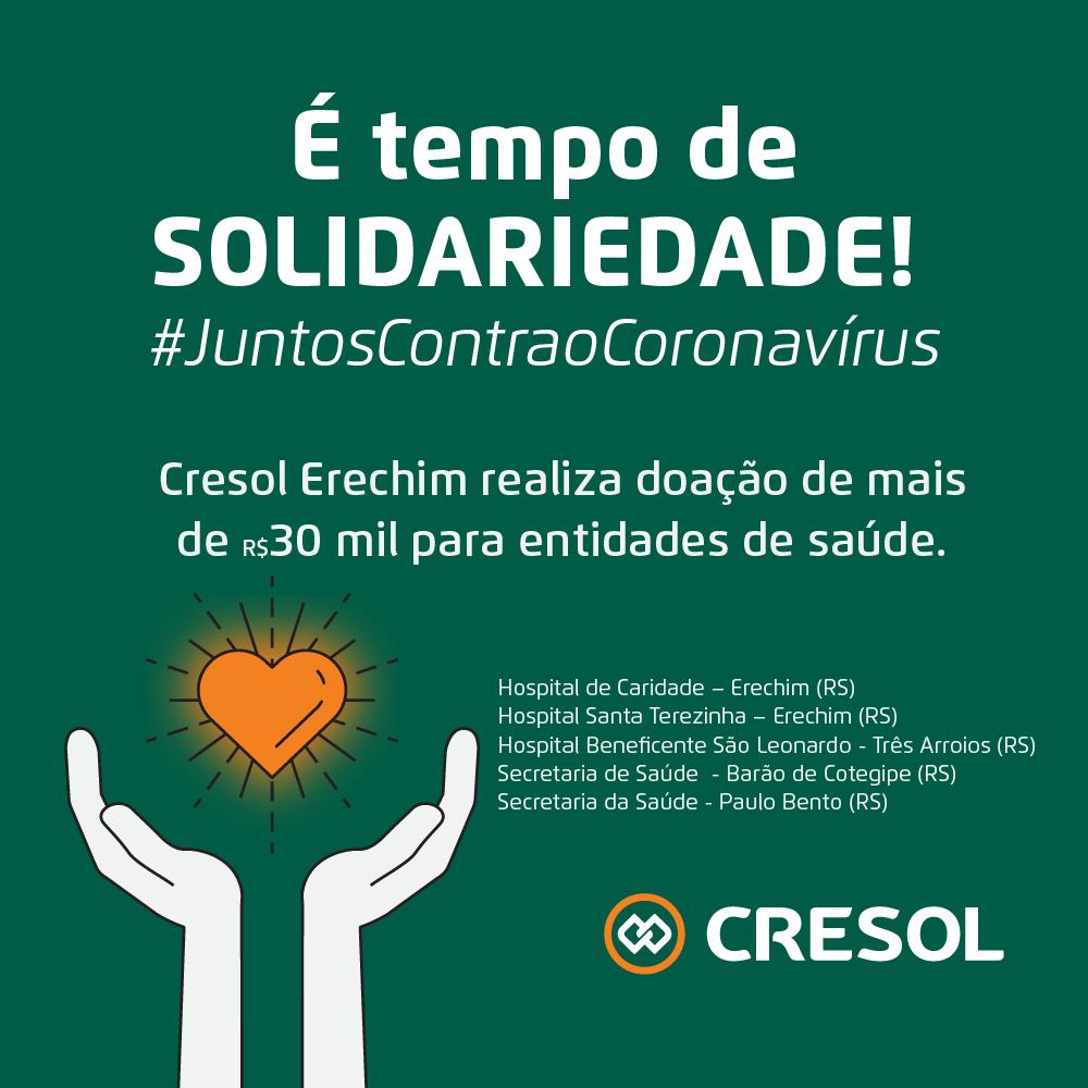 Diante do avanço da pandemia de Coronavírus no país, a Cresol de Erechim se uniu a uma corrente do bem e destinou mais de R$30 mil a entidades de saúde que trabalham no combate e tratamento de infectados pelo coronavírus na região do Alto Uruguai. A doação ocorreu na última sexta-feira (27), e irá beneficiar hospitais e secretarias de saúde de quatro municípios.