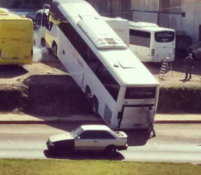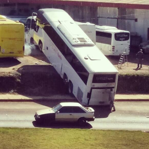 Ninguém se machucou, e outro ônibus foi utilizado para puxar o veículo caído.