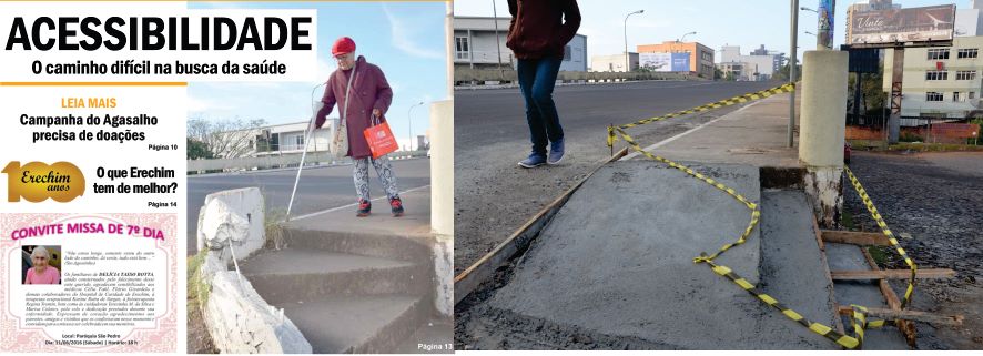 Na edição de 10 de junho o Jornal Bom Dia publicou reportagem sobre os problemas de acessibilidade enfrentados por pedestres na travessia do Viaduto Rubem Berta. A foto da capa mostrou o caso da aposentada Neusa Andrade Reis. A moradora de Erechim sofreu um acidente vascular cerebral e, naquele dia, após buscar atendimento na Secretaria Municipal de Saúde, precisou de ajuda para acessar a passarela do viaduto que liga o ncentro de Erechim ao Bairro Ipiranga.