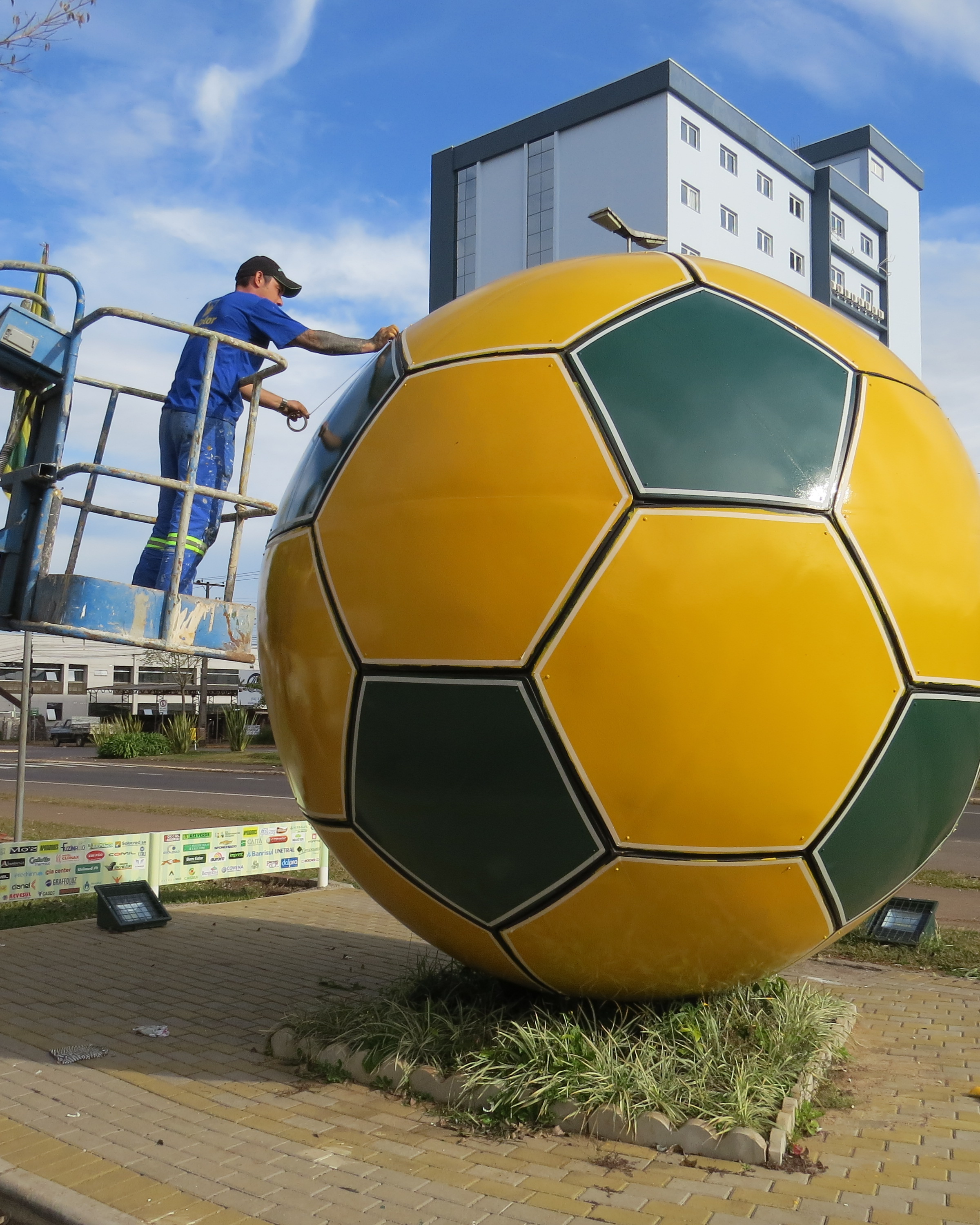O funcionário de uma empresa de pinturas especiais, Uilson Pereira, 38, foi fotografado na tarde de quinta-feira (30), pintando o mais novo monumento da cidade. A maior bola estática em estádio de futebol, localizada em frente ao Colosso da Lagoa, está sendo preparada para a passagem da Tocha Olímpica por Erechim. Pereira disse que está acostumado com o trabalho, mas que se sente feliz por deixar o monumento mais bonito para domingo (3). Acrescentou que a expectativa é grande e que pretende levar toda a família para acompanhar o trajeto da chama.