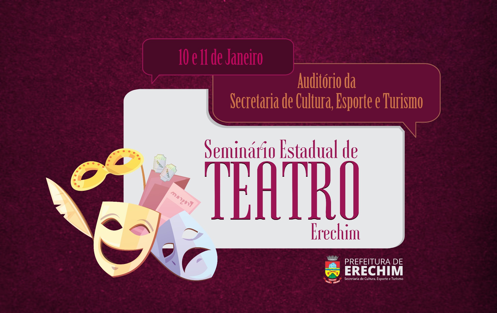 Para iniciar o ano com formação, construção conjunta e debate acerca da Cultura, como parte do Sistema de Formação e Qualificação, a Secretaria de Cultura, Esporte e Turismo promove, nos dias 10 e 11 de janeiro de 2022, o Seminário Estadual de Teatro.