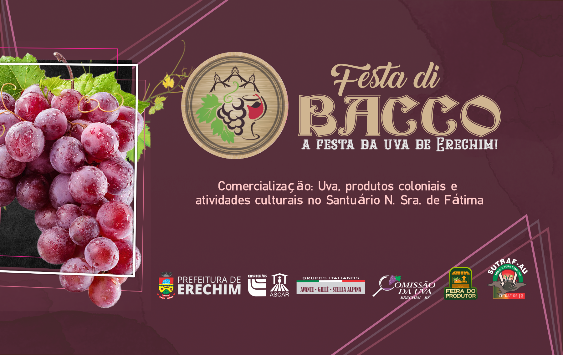 Já a Festa Di Bacco com comercialização de uva, vinho, produtos coloniais, artesanato, flores e atividades culturais iniciam no sábado (22). Serão dois finais de semana com atividades no Santuário Nossa Senhora de Fátima. Nessas atividades serão observados protocolos contra Covid-19 como uso de máscara e álcool em gel. A expectativa é que 21 produtores rurais e agroindústrias comercializem seus produtos. A organização não estimou a quantia de uva que deve ser vendida.