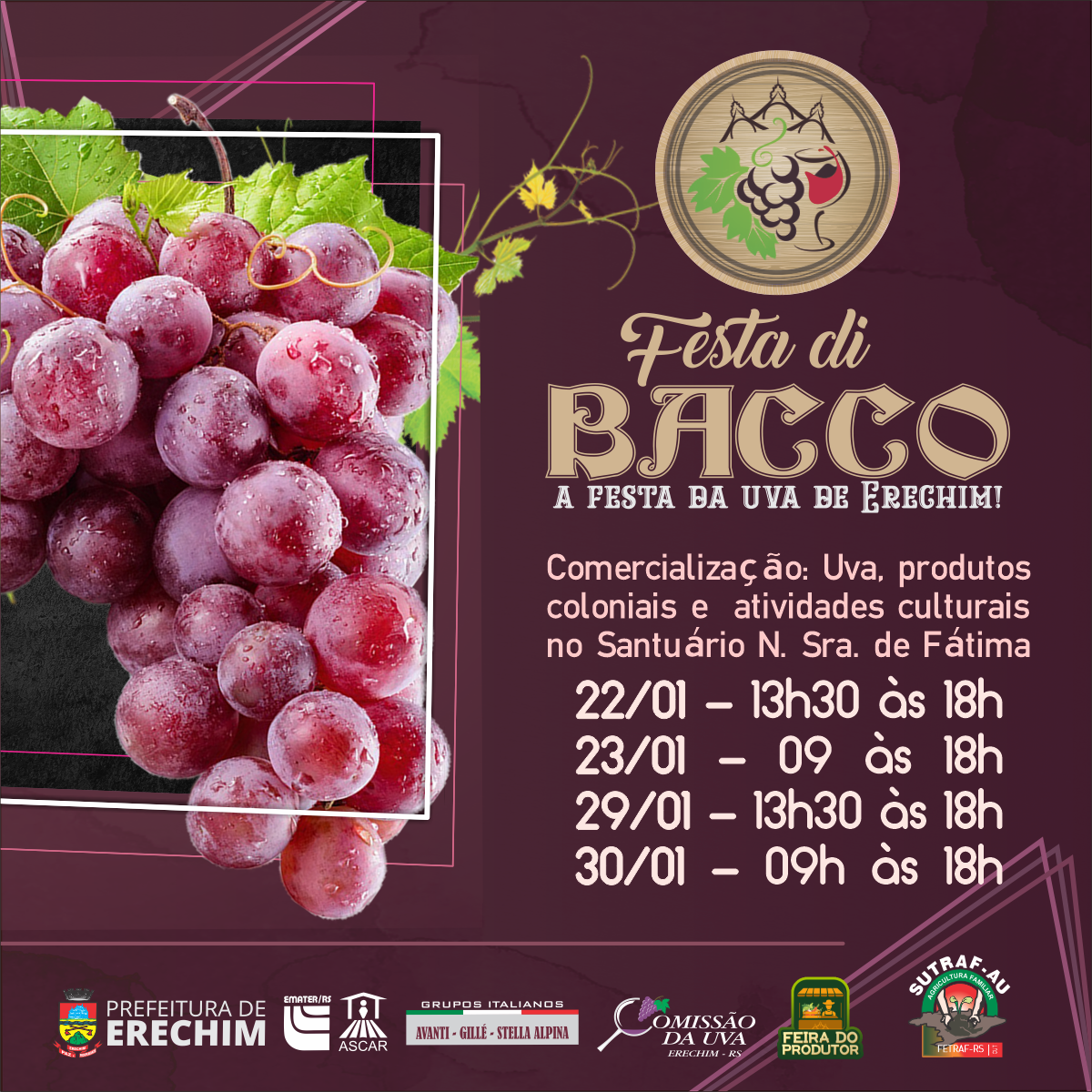 Começa na próxima semana, a Festa Di Bacco 2022: a festa da uva de Erechim. O período tem início com a colheita da safra da uva, que será marcada por uma solenidade simbólica na quarta-feira (19), às 19 horas na propriedade ‘La Cantina Slongo’, destinada a produtores e convidados.
