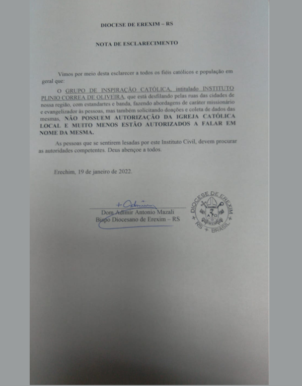 O GRUPO DE INSPIRAÇÃO CATÓLICA intitulado INSTITUTO PLÍNIO CORREA DE OLIVEIRA, que está desfilando pelas ruas das cidades de nossa região, com estandartes e banda, fazendo abordagens de caráter missionário e evangelizador às pessoas, mas também solicitando doações e coleta de dados das mesmas NÃO POSSUI AUTORIZAÇÃO DA IGREJA CATÓLICA LOCAL E MUITO MENOS ESTÁ AUTORIZADO A FALAR EM NOME DA MESMA.