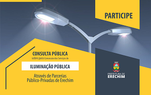 No dia 24/02/22 será realizada na Câmara de Vereadores de Erechim, às 10h, a audiência pública sobre a concessão dos serviços de iluminação pública, onde serão apresentados os pontos relevantes do edital e anexos, que impactam na concessão que está em andamento. A transmissão será ao vivo pelo canal do Youtube da TV Câmara, no link www.youtube.com/tvcamaraerechim que disponibiliza chat para envio de questionamentos e pelo Facebook da Prefeitura de Erechim.