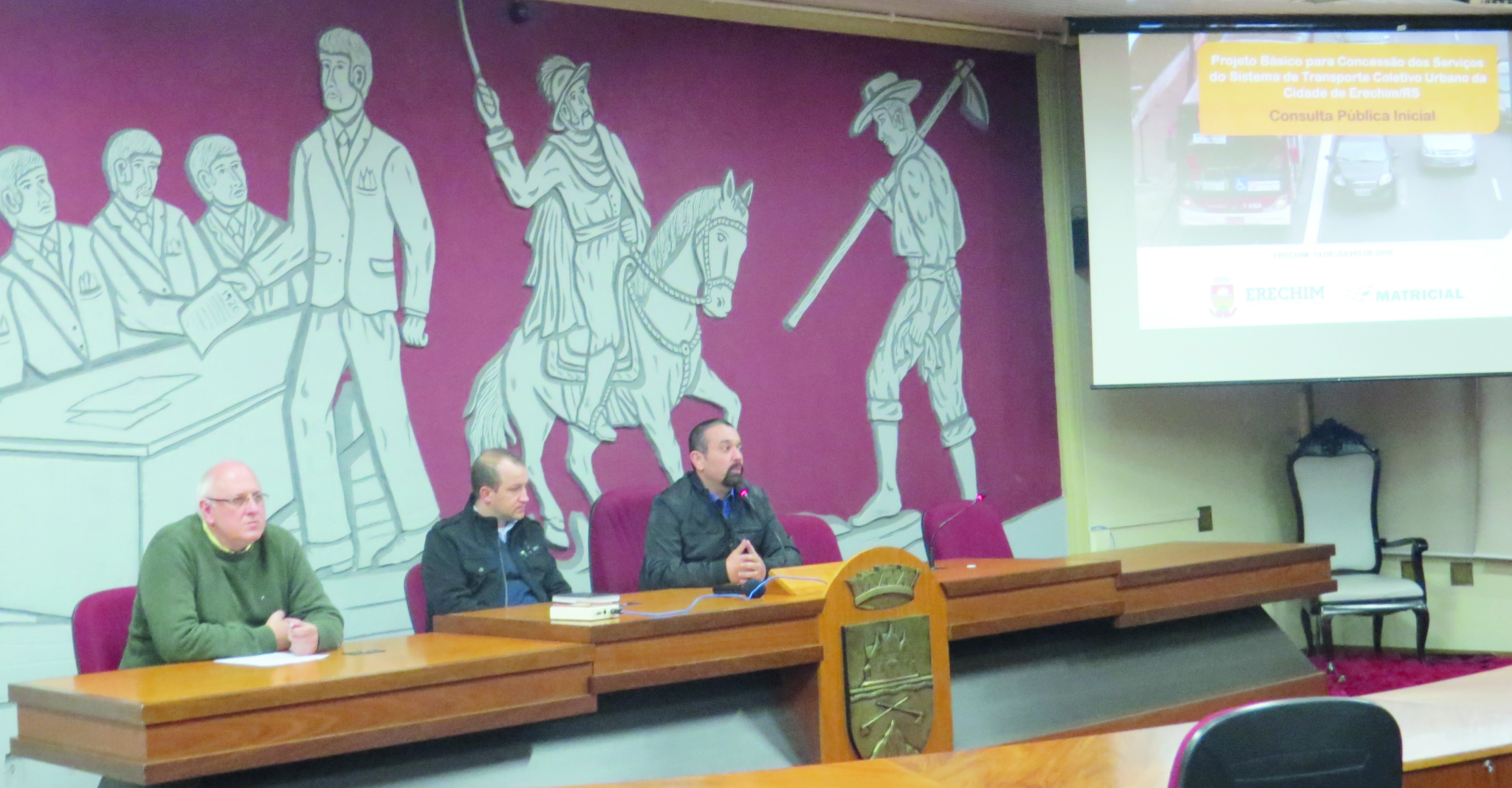 Em cumprimento a uma determinação legal, o município de Erechim organiza o primeiro processo licitatório referente ao transporte coletivo urbano. Na noite de terça-feira (19), o secretário de Segurança, Rafael Testa, juntamente com o secretário de administração, Itamar Luis Dall'Alba e o engenheiro André Bresolin Pinto, apresentaram o plano de trabalho do projeto básico sobre a licitação do transporte.