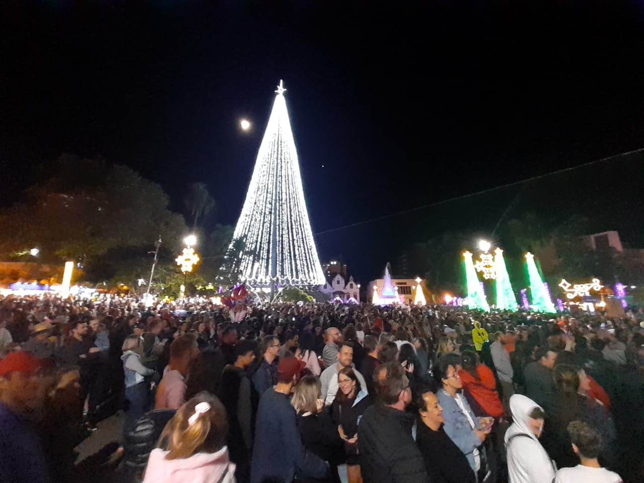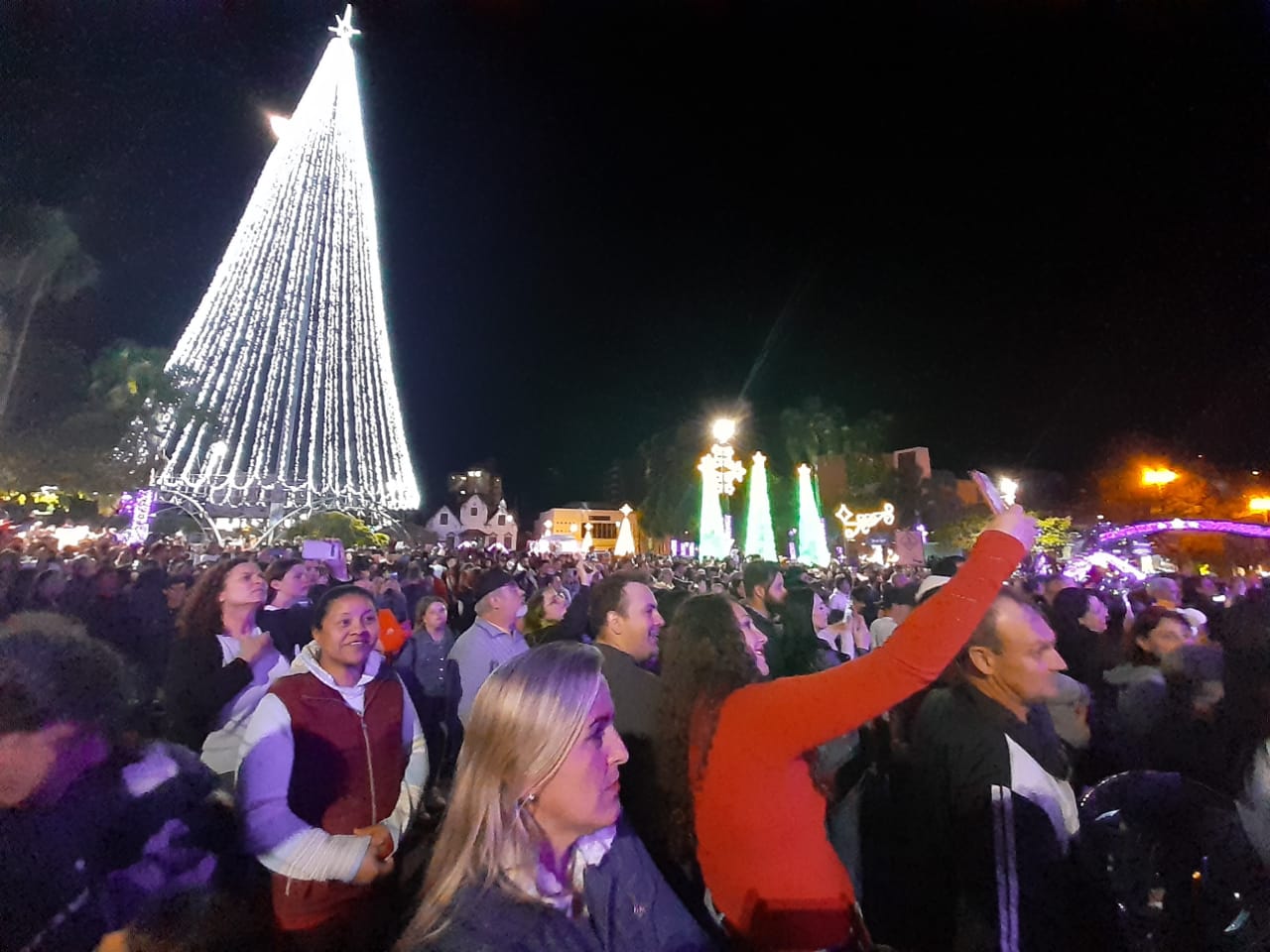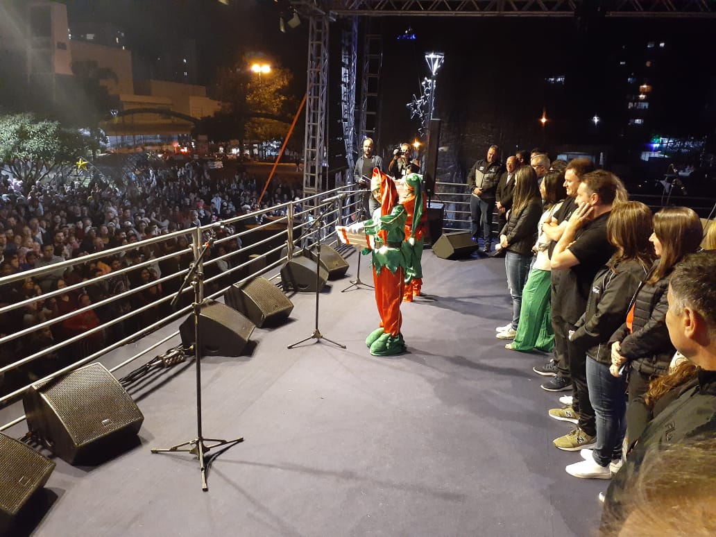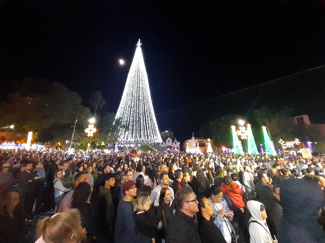 Uma multidão com mais de 10 mil pessoas lotou a Praça da Bandeira para viver a magia do Natal, confraternizar, renovar a fé, buscar alegria, paz e amor, na noite de domingo (6), com a inauguração das luzes do “Natal Erechim 2022 – Renovando Sonhos”. Neste ano, as celebrações natalinas iniciaram um pouco mais cedo para oportunizar mais atrações às famílias e movimentar o comércio local.
