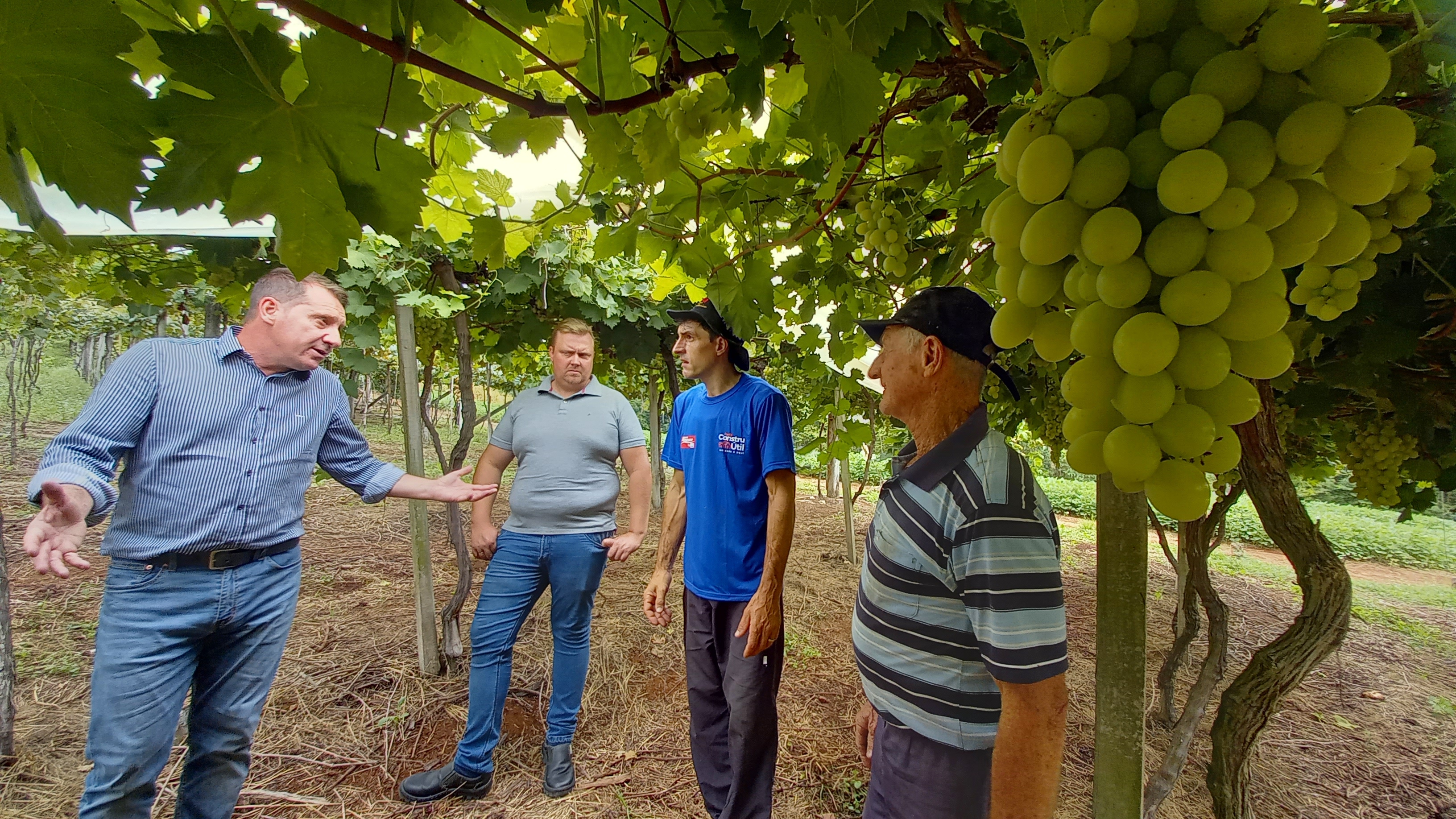 Uma das visitas, foi na propriedade da família Guerino, Zeni e Joel Dariva. A família produz cerca de dois hectares de uva, de mesa e para produção de vinho. Conforme contaram os produtores, ainda, no ano passado, os parreirais foram afetados devido ao granizo e agora, a produtividade também teve impacto devido à estiagem.