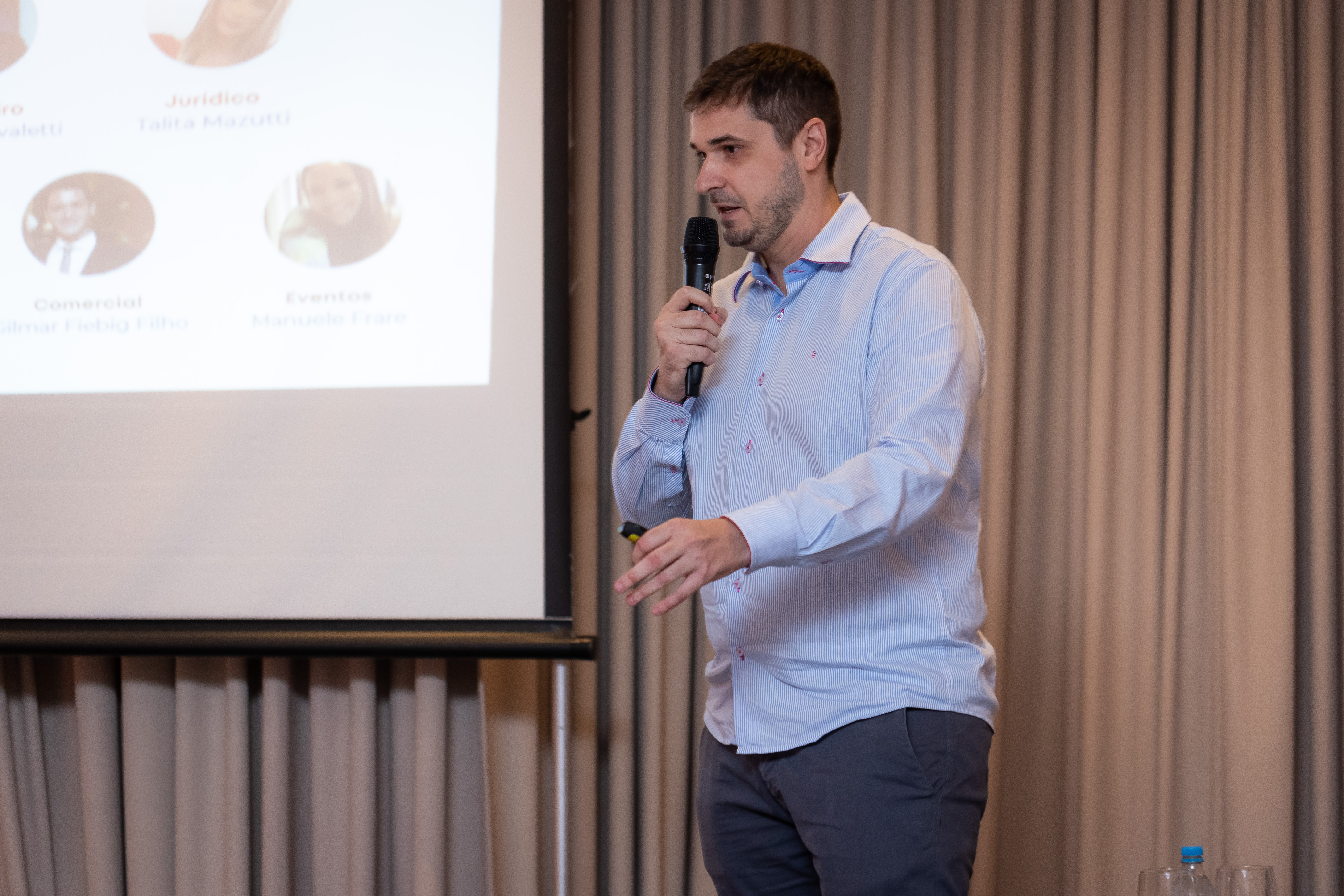 Antes da palestra, o presidente da ACCIE Jovem, Lucas Jaskulski, falou sobre a entidade, criada em 2019, que tem como propósito atuar na defesa dos interesses de seus associados e da comunidade e fomentar o desenvolvimento local e regional, além de realizar atividades complementares voltadas ao desenvolvimento dos jovens líderes empresariais.