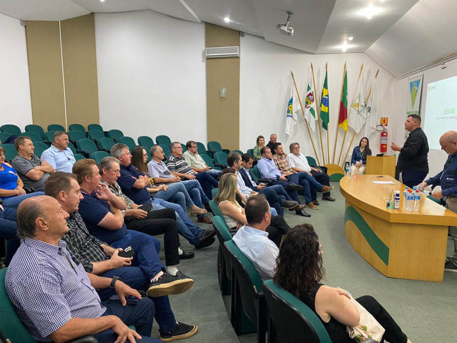 O prefeito de Erechim, Paulo Polis, acompanhado do secretário de Agricultura, Abastecimento e Segurança Alimentar, William Racoski, e do coordenador de Tributos, Itamar Luis Dall' Alba, participaram, na noite de terça-feira (21), de palestras, no Sindicato Rural de Erechim, sobre o SENAR, com Herton Lima, e valor da terra nua, com Derli Girard e Luis Fernando Pires. Estavam presentes, também, prefeitos da região e produtores rurais.