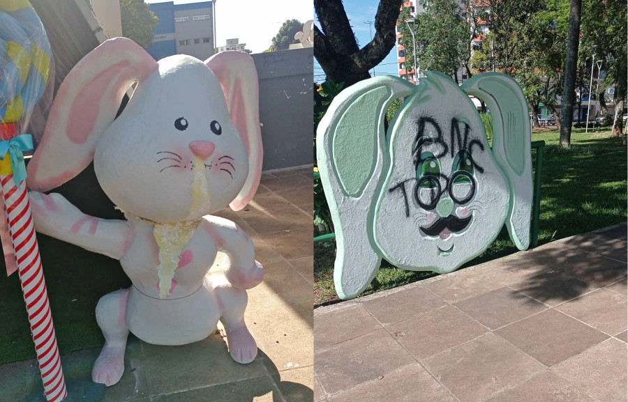 A decoração de Páscoa da Praça Prefeito Jayme Lago de Erechim ainda não foi inaugurada e alguns enfeites já estão depredados. Conforme informações divulgadas pelas Prefeitura de Erechim na manhã desta quinta-feira (30), alguns objetos da decoração foram vandalizados com pichações e outros estragados.