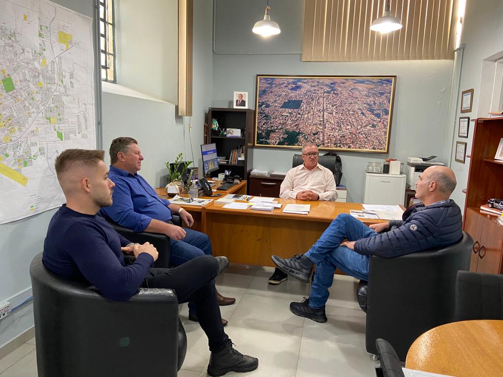 O secretário de Obras Públicas, Habitação, Segurança e Proteção Social, Mario Rossi, acompanhado do secretário adjunto, Rafael Colet, e o coordenador da Sala de Aceleração de Projetos, Altemir Barp, recebeu, na manhã desta quinta-feira (27), no gabinete, a visita do empresário, Egídio Zorzi, sócio-proprietário da Plaxmetal.