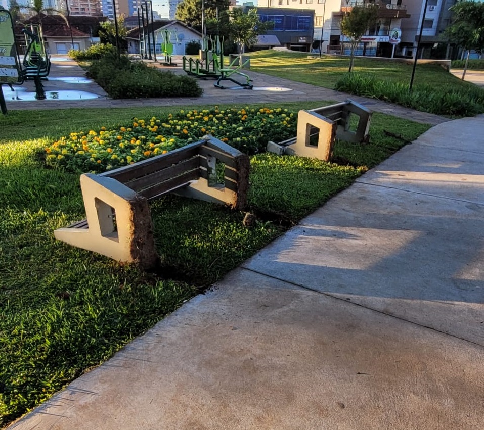 Na ocasião, boa parte dos conjuntos de bancos e mesas foram covardemente arrancados do concreto, além da destruição dos jardins e das flores, que fazem parte das obras de paisagismo no local.