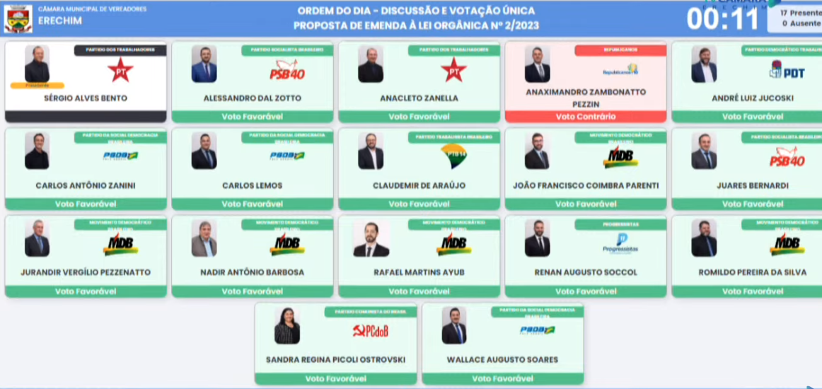 Projeto de Lei do Executivo, aprovado na tarde de ontem, 28, na Câmara de Vereadores de Erechim, alterou artigos da Lei Orgânica, visando atualizar e compatibilizar a Reforma da Previdência, de 12 de novembro de 2019, com o Instituto Erechinense de Previdência (IEP). Foi aprovado com 16 votos favoráveis e um contrário, do vereador Anaximandro Zambonatto Pezzin (Republicanos).