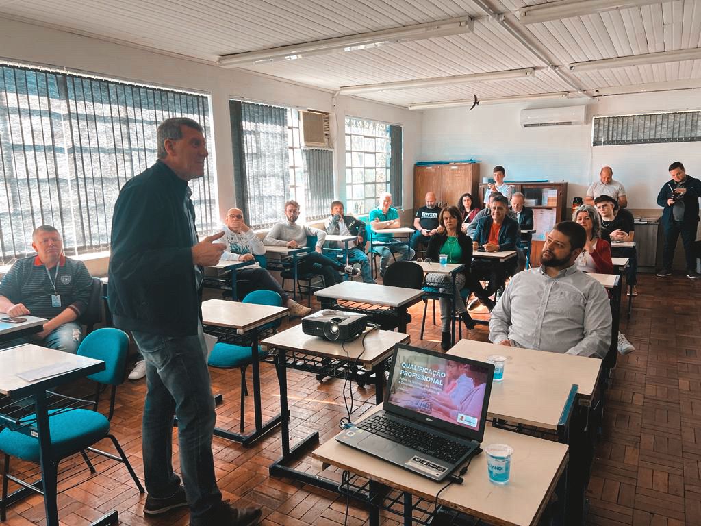 Através da apresentação do panorama do mercado de trabalho no Rio Grande do Sul e das medidas do Governo do Estado para diminuir o desemprego e ampliar a qualificação de mão de obra, o secretário de Trabalho e Desenvolvimento Profissional, Gilmar Sossella, conduziu um bate-papo com lideranças empresariais e autoridades da cidade de Erechim, na manhã deste sábado (16/9), durante o Feirão de Empregos realizado no Ginásio do Colégio Estadual Haidée Tedesco Reali.
