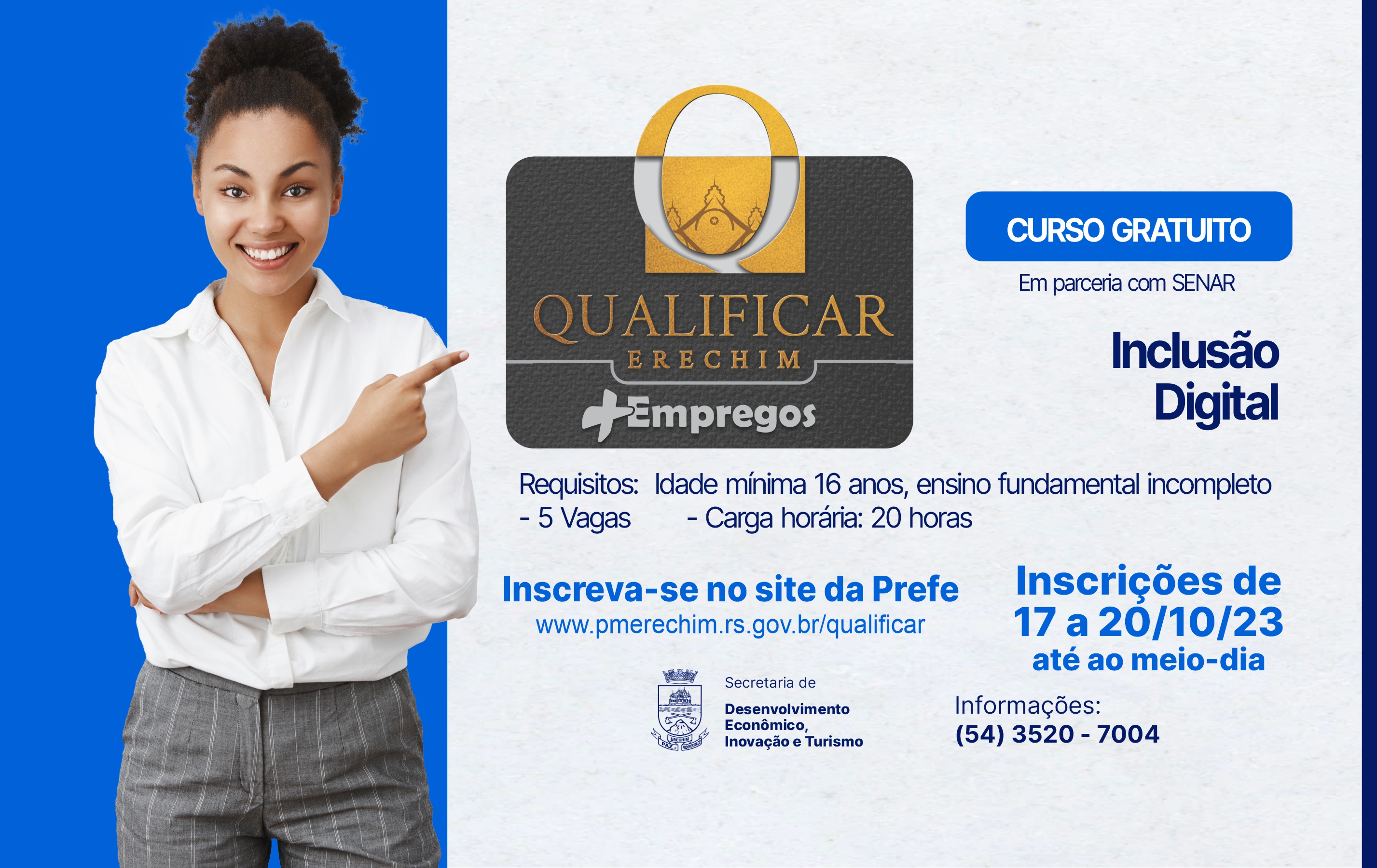 A Prefeitura de Erechim, através da Secretaria de Desenvolvimento Econômico, Inovação e Turismo oferece cinco vagas para o curso de Inclusão Digital, através do Qualificar Erechim + Empregos. Confira o edital clicando aqui. Veja abaixo mais informações: