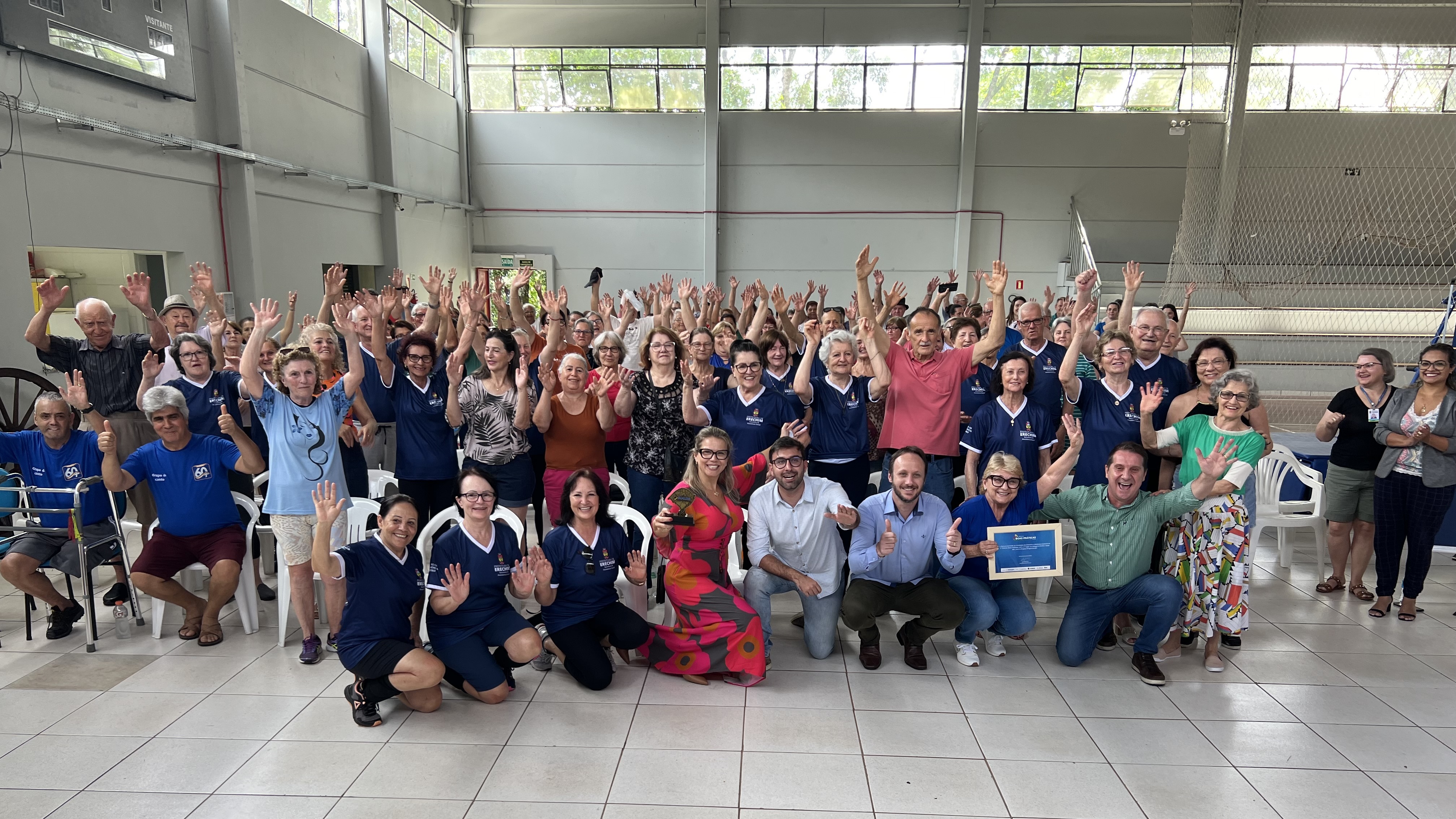A manhã desta quinta-feira (30) foi de comemoração junto aos integrantes do Programa 60+, idealizado pela Prefeitura de Erechim, através da Secretaria de Assistência Social. O prefeito e o vice de Erechim, Paulo Polis e Flávio Tirello, juntamente com a secretária de Assistência Social, Clarice Moraes e a coordenadora do Programa, Clarisse Maronesi entregaram para os integrantes do Programa 60+ e equipe a premiação recebida da Federação das Associações de Municípios do Rio Grande do Sul (Famurs), onde o Programa 60+ foi classificado como campeão do 5° Prêmio Boas Práticas na categoria de Melhor Idade.