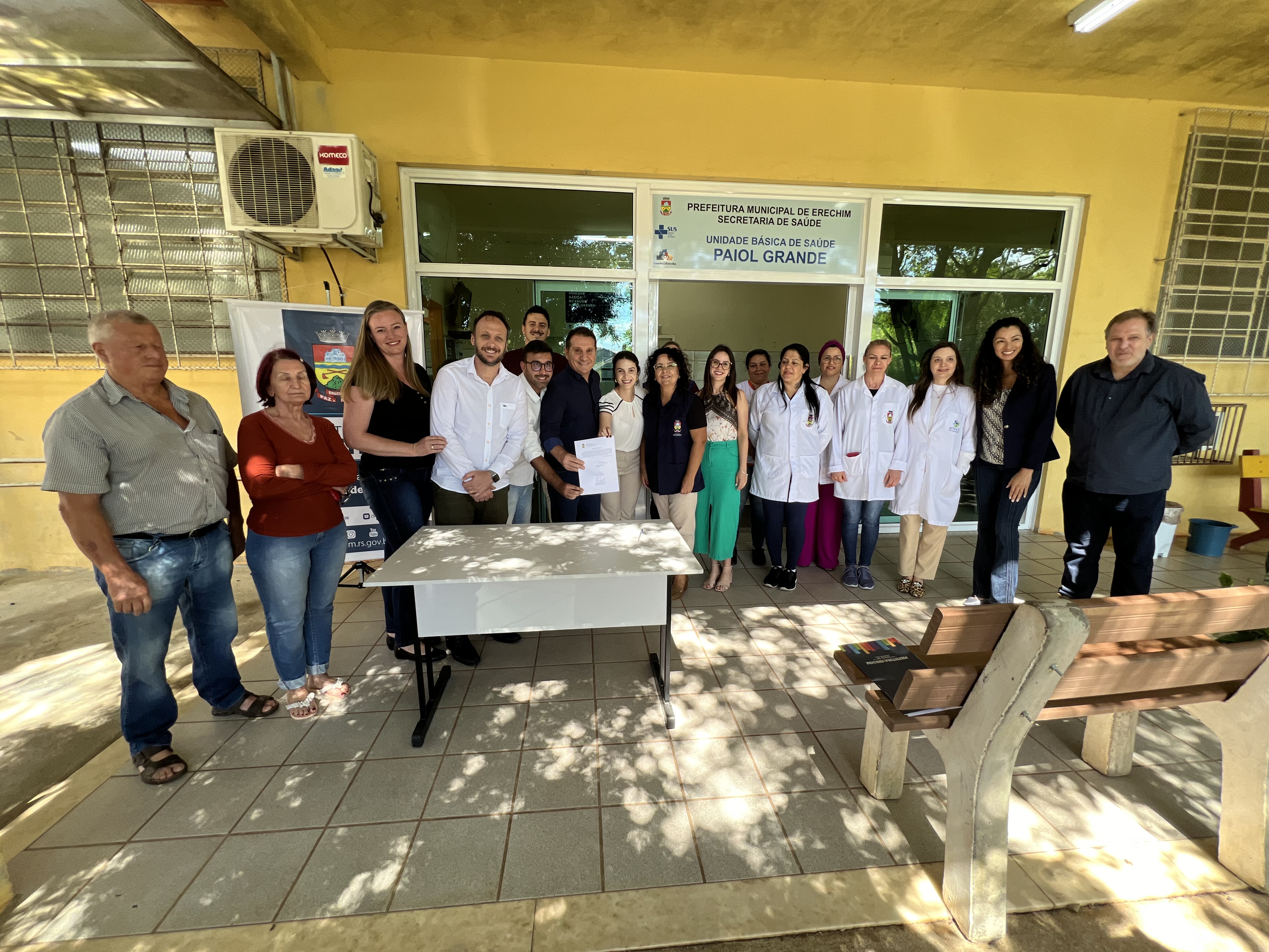 Na tarde desta quinta-feira (25) foi assinado contrato para ampliação e reforma da UBS Paiol Grande. Estiveram presentes ao ato de assinatura o prefeito e vice de Erechim, Paulo Polis e Flávio Tirello; a secretária de Saúde, Éclesan Palhão, o presidente da Câmara de Vereadores, Jurandir Pezenatto; os parlamentares Fifo Parenti – que destinou emendas impositivas para a obra juntamente com o vereador Sérgio Alves Bento; o vereador Wallace Soares; a coordenadora da UBS, Fabiani Breancini; funcionários da Unidade; o proprietário da empresa vencedora da licitação, Lisandro Battisti; a presidente da Associação de Moradores do Paiol Grande, Mariele Sommer; demais secretários de Governo.