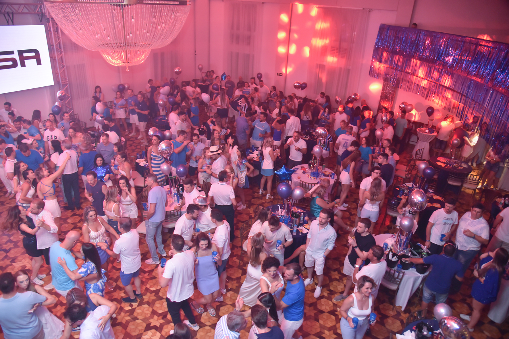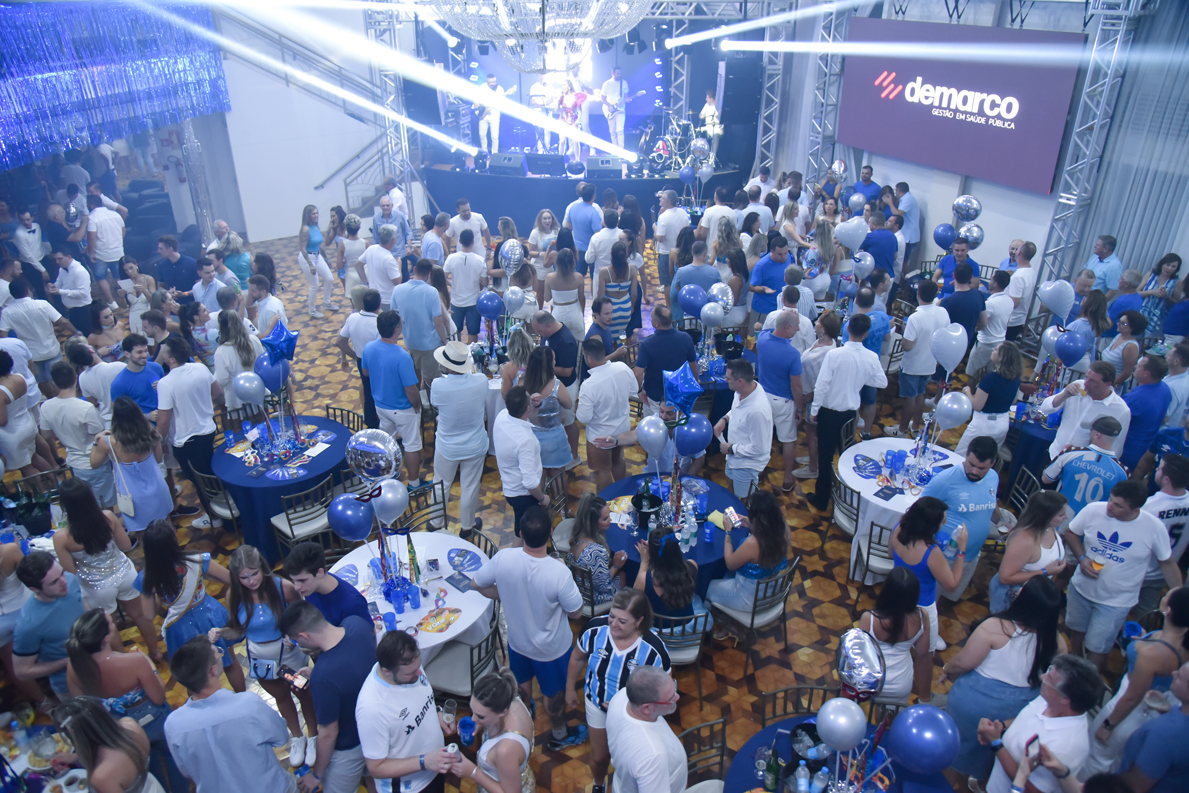 O salão estava todo decorado nas cores do baile, azul e branco, com balões e arranjos carnavalescos nas mesas, máscaras, ambiente diferenciado com lounge e espaço instamagrável onde os foliões puderam tirar muitas fotos e postar nas redes sociais.