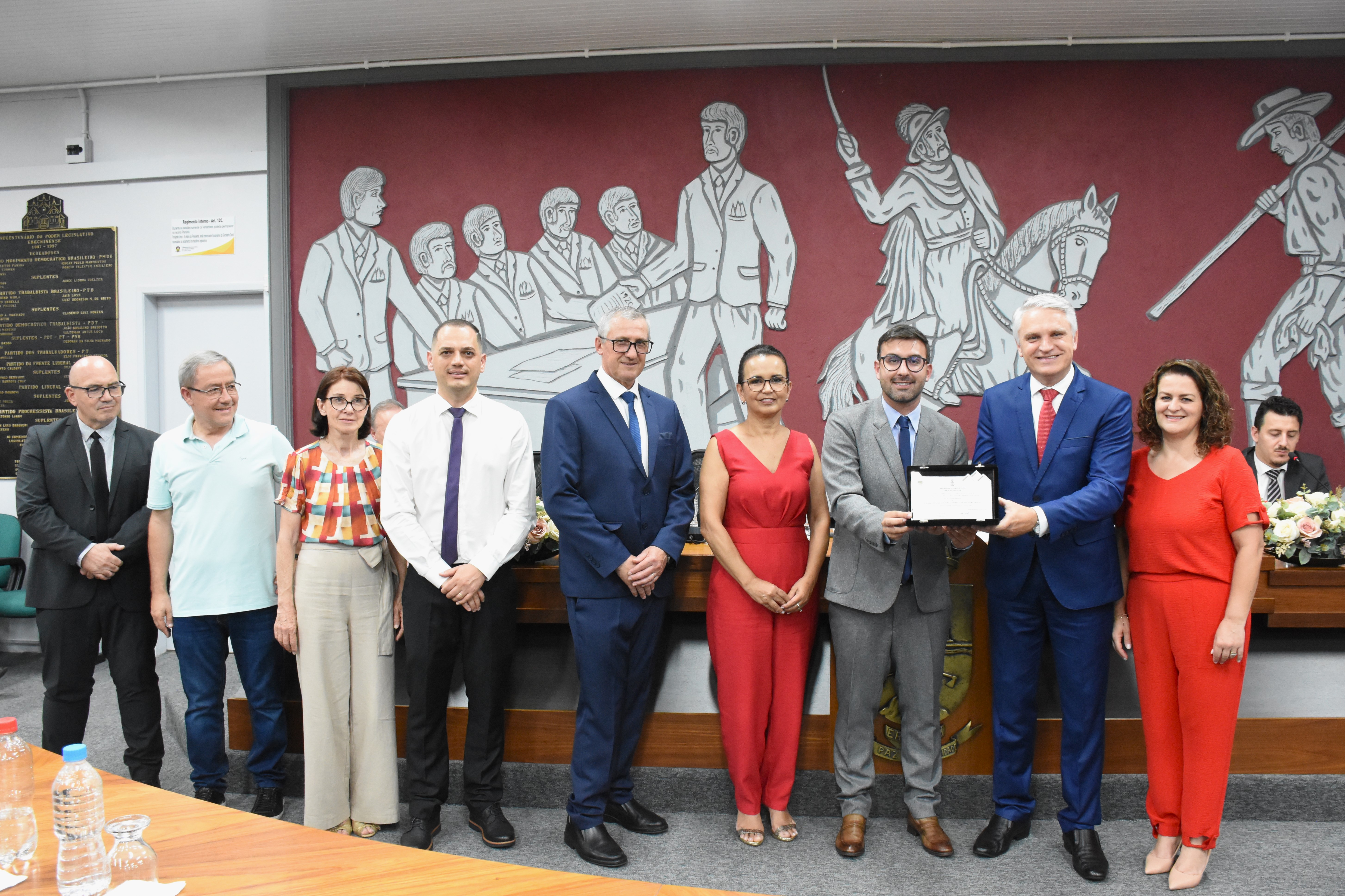 A noite de terça-feira, 6/02, foi marcada por uma importante homenagem a uma instituição consolidada no município através de uma rica trajetória nos âmbitos religioso e social. A partir de proposição do vereador Fifo Parenti (MDB), o Poder Legislativo entregou Menção Honrosa à Igreja Evangélica Pentecostal O Brasil para Cristo, em reconhecimento a seus 20 anos de atuação em Erechim. Na oportunidade, músicos da igreja abrilhantaram a sessão com a apresentação de canções aos presentes no plenário da Câmara. A mesa de autoridades foi composta pelo presidente Jurandir Pezzenatto (MDB); secretária municipal da Fazenda, Ana Oliveira; pastor e presidente da homenageada, Edgar Radeski; presidente do Conselho de Pastores e Igrejas (CONPAI), Eduardo Liotto; presidente da ACCIE, Darlan Dalla Rosa; e o primeiro secretário do Legislativo, Wallace Soares (PSDB).