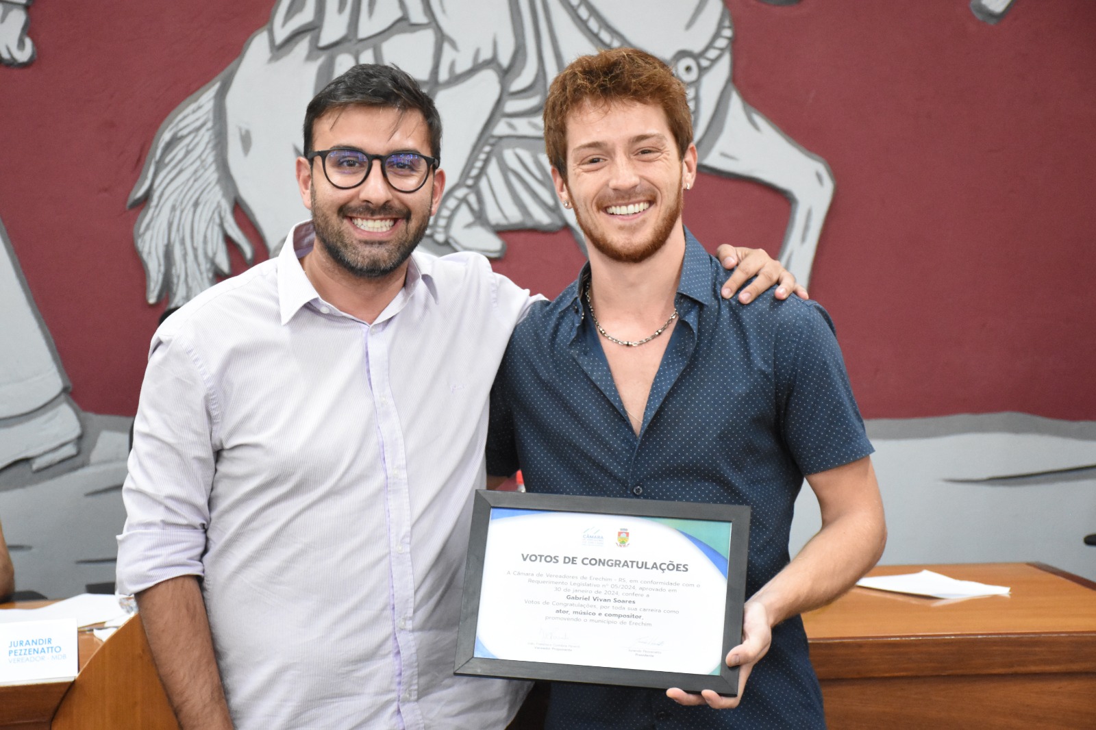 Na última sessão ordinária do Poder Legislativo, realizada na terça-feira (6), foram entregues Votos de Congratulações ao artista erechinense Gabriel Vivan Soares. Através de proposição do vereador Fifo Parenti (MDB), o jovem ator, músico e compositor foi homenageado em virtude de sua bem-sucedida carreira, que recentemente ganhou notoriedade em todo o Brasil com a participação na produção “Reis”, da Record TV.