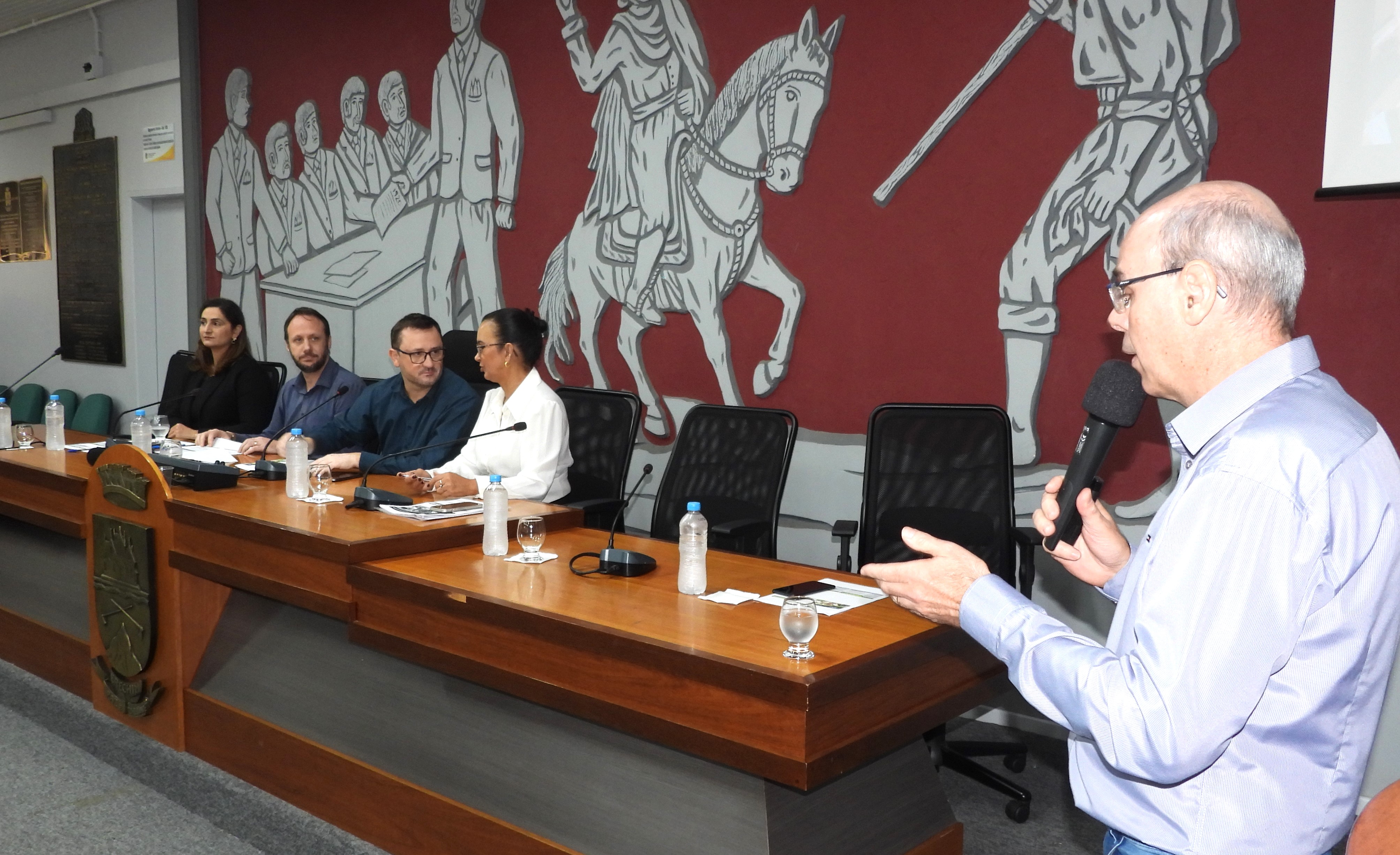 A audiência pública foi comandada pelo presidente da Comissão de Economia e Finanças do Poder Legislativo, Ale Dal Zotto, e na mesa de autoridades o vice-prefeito Flávio Tirello, e as secretárias da Fazenda e Planejamento, respectivamente, Ana Oliveira e Aline Prichua.