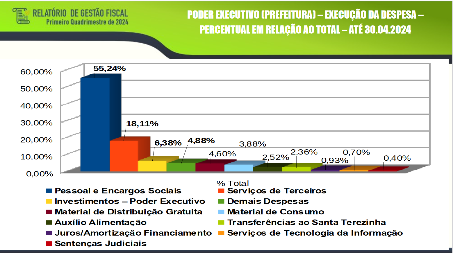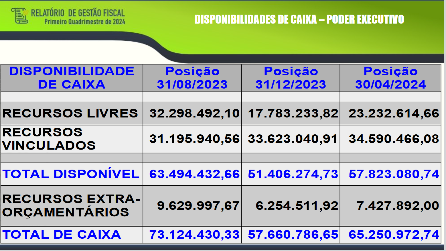 A seguir, um pouco dos números apresentados, as fontes de receitas, os gastos, e o saldo da caixa da Prefeitura de Erechim, em 30 de abril de 2024.